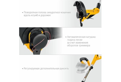 Мощность, Вт 600. Частота вращения шпинделя, об/мин 9000. Режущий элемент леска. Ширина скашивания (леска), см 33. Ширина скашивания (нож), см -. Толщина лески, мм 1.4. Тип катушки автоматическая. Тип рукоятки D-образная. Тип штанги телескопическая. Ремень нет. Напряжение питания, В/Гц 230 / 50. Габариты, см 88x26x11. Масса изделия, кг 2.9. Масса в упаковке, кг 3.7.