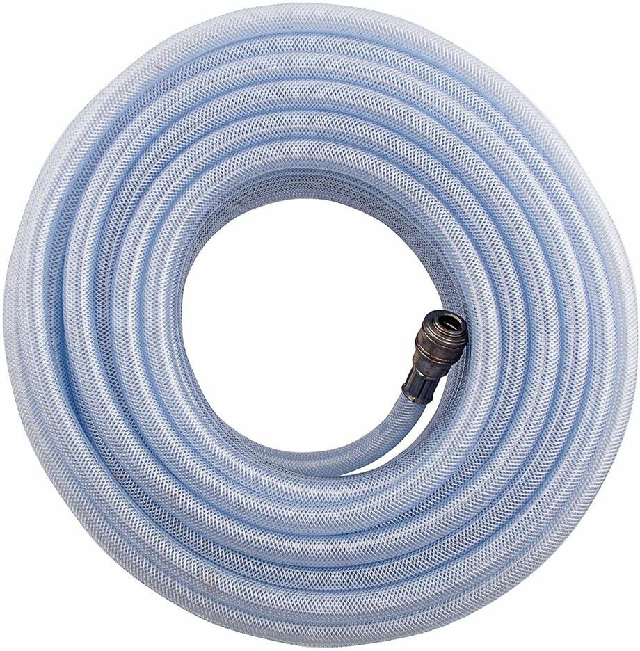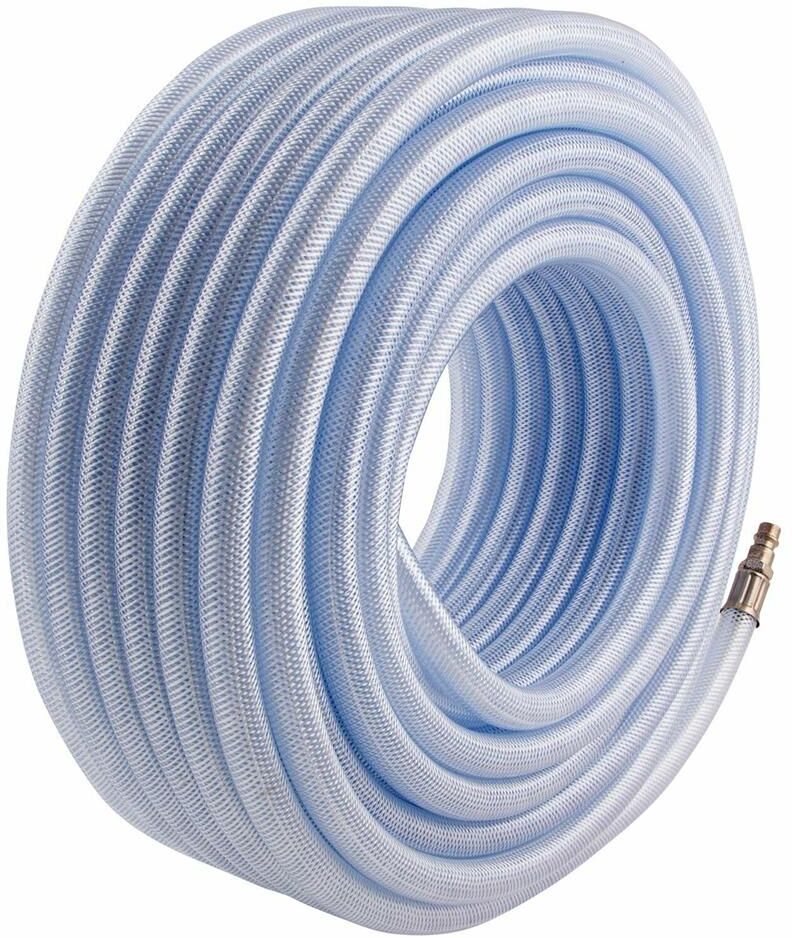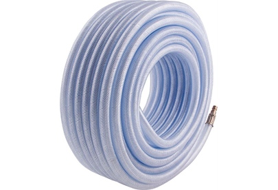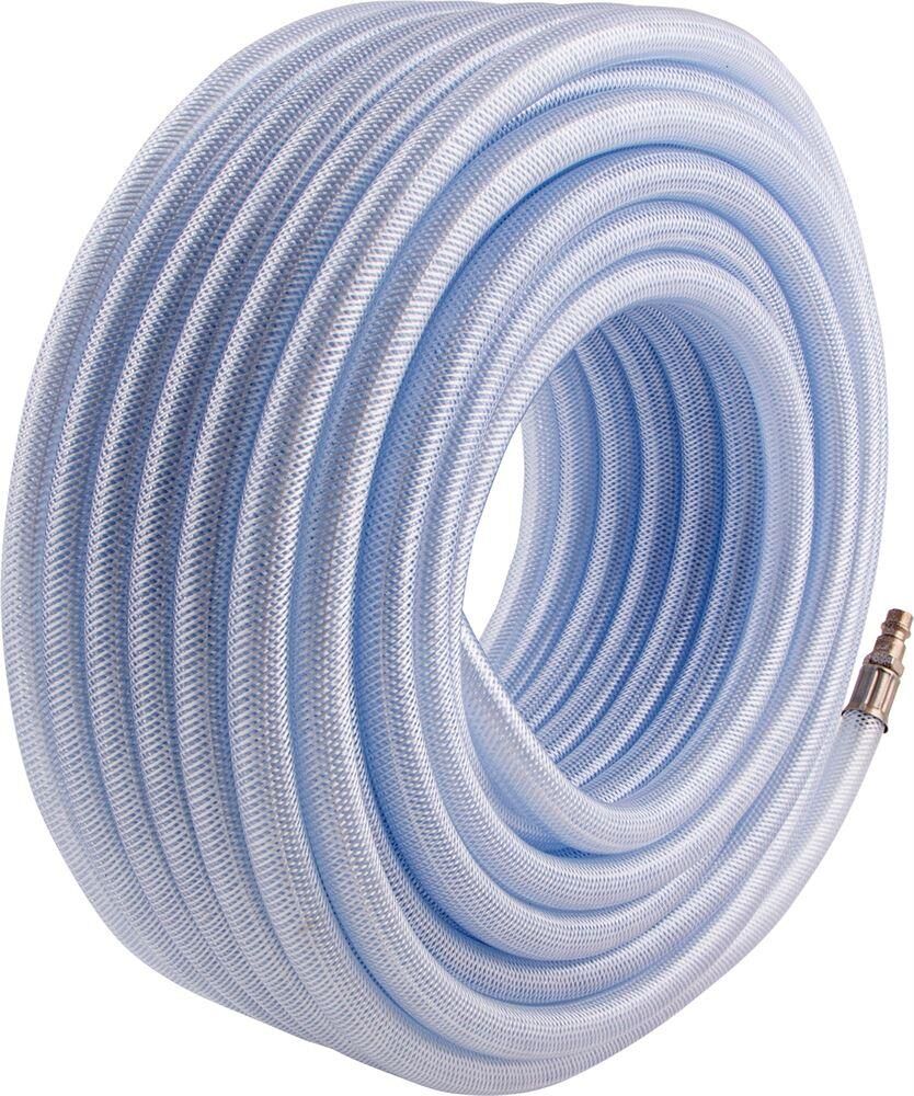 Шланг пневматический армированный прозрачный Stels 57027 из ПВХ, диаметром 10 х 16 мм и длиной 30 м, с быстросъемными соединениями, выдерживает давление до 18 бар. Предназначен для соединения между собой мощных компрессоров и инструментов с пневматическим приводом, а также прокладки магистральной пневмолинии. Шланг подойдет для использования на производственном предприятии, строительной площадке или в автосервисе.ПреимуществаКачественное исполнение — шланг изготовлен из ПВХ и имеет армирующий слой из полиамида, поэтому характеризуется высокой прочностью и устойчивостью к падениям и пережатиям, а также невосприимчивостью к химическим воздействиям.Долговечность — антикоррозийное никелевое покрытие защищает стальные штуцер и муфту от разрушения, рукав увеличенной толщины отличается высокой прочностью.Быстрая подготовка к работе — соединения типа «рапид» упрощают подключение шланга к компрессору и пневматическим инструментам.Комфортная работа — шланг длиной 30 м позволяет мастеру беспрепятственно перемещаться по