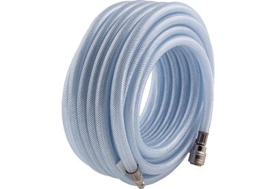 Армированный прозрачный пневматический шланг Stels 57025 из ПВХ, 10 х 16 мм, длиной 15 м, с быстросъемами, выдерживает давление до 18 бар и предназначен для соединения между собой мощных компрессоров и инструментов с пневматическим приводом, а также прокладки магистральной пневмолинии. Изготовлен из ПВХ и имеет армирующий слой из полиамида, поэтому характеризуется высокой прочностью и устойчивостью к падениям и пережатиям, а также невосприимчивостью к химическим воздействиям. Шланг подойдет для использования на производственном предприятии, строительной площадке или в автосервисе.ПреимуществаШланг можно быстро подключить к компрессору и пневматическим инструментам благодаря быстросъемным соединениям типа рапид.Штуцер и муфта прослужат долго, поскольку изготовлены из прочной углеродистой стали и защищены от коррозии никелевым покрытием.Длины 15 м достаточно для беспрепятственного перемещения мастера по рабочему пространству.Увеличенная толщина шланга повышает его износостойкость и продлевает срок службы.