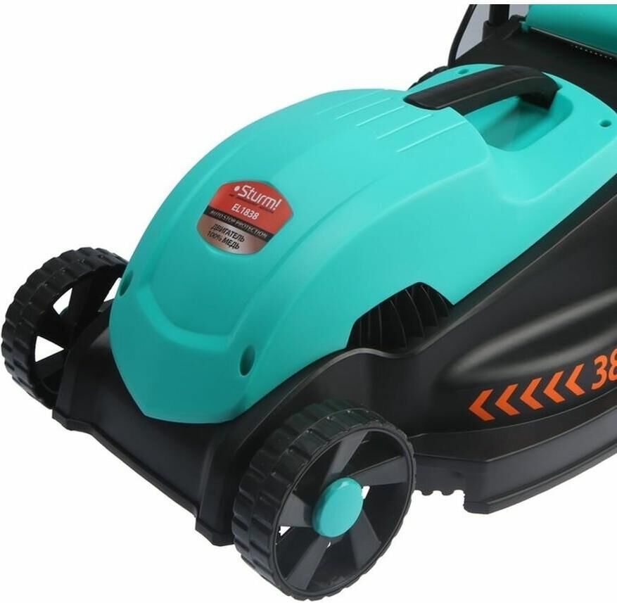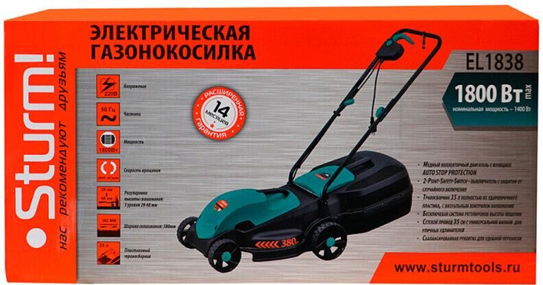 Размер колес 14/17 см. Объем травосборника (л) 35. Напряжение питания (В) 220. Вид упаковки Коробка. Масса нетто (в собранном, рабочем состоянии, но без аксессуаров) (кг) 9. Габариты в упаковке (ДхШхВ, см) 67x46x33. Максимальная мощность (Вт) 1 800. Регулировка высоты скашивания осевая. Вес инструмента в сборе без упаковки и аксессуаров (кг) 9. Срок гарантии 14 мес.. Защита от перегрева Да. Комплектация Газонокосилка, травосборник, рукоятка с набором крепежа, фиксаторы силового кабеля, инструкция по эксплуатации. Ширина скашивания (мм) 380. Номер на схеме EL1838. Высота скашивания (кол-во уровней/мм) 3/28-48-68. Тип режущего элемента нож. Травосборник (материал/л) пластик/35. Колеса передние/задние () 5,5/7. Версия 1.0. Вес 10.45 кг.