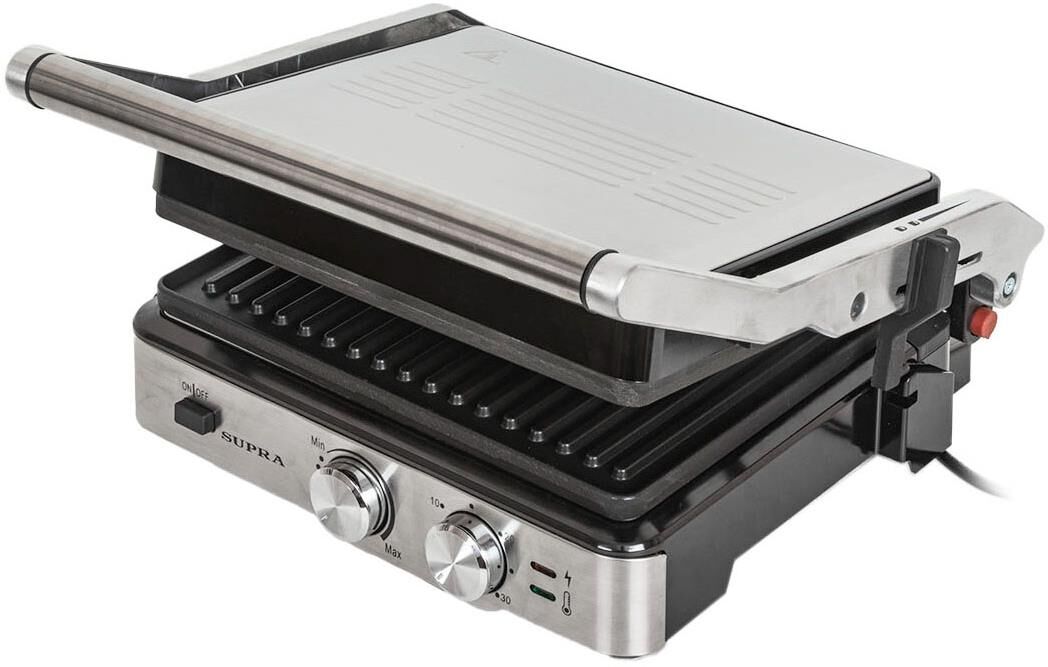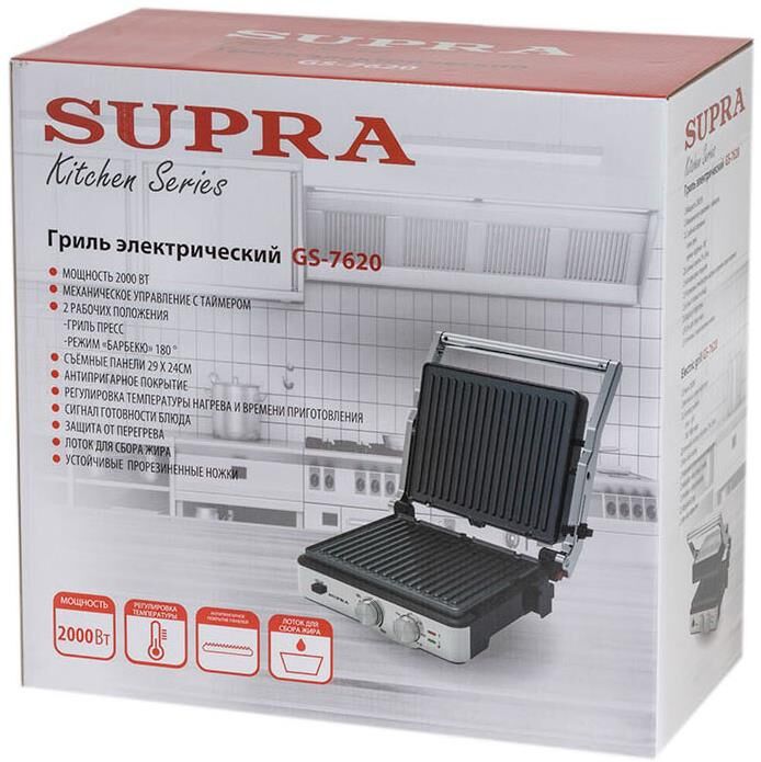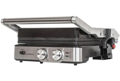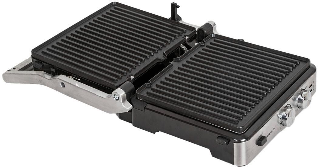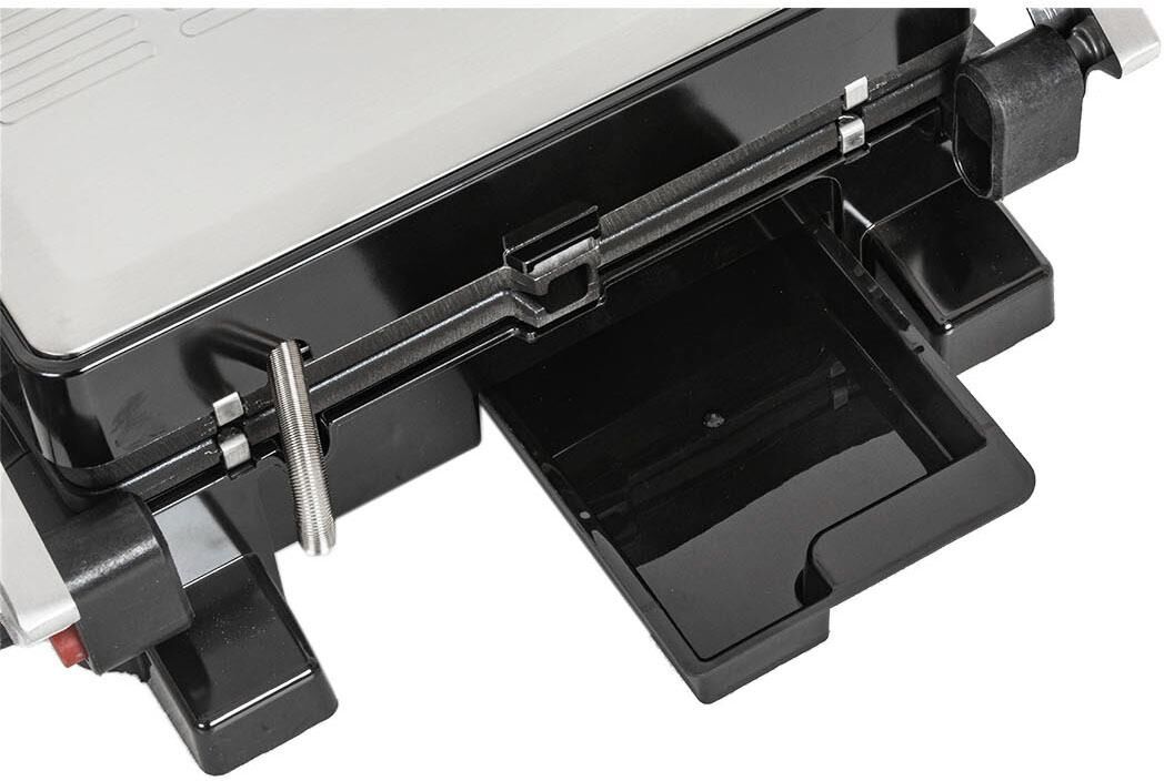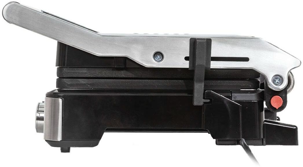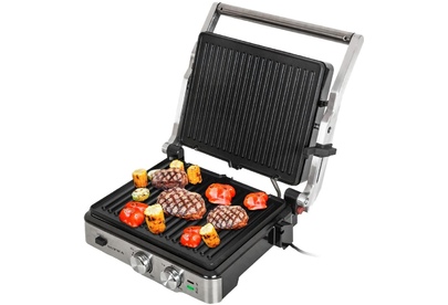 мощностью 2000 Вт, сенсорное управление, гриль-пресс, режим "барбекю" (180 градусов), съемные панели, размер панелей 29х24 см, контейнер для сбора жира
