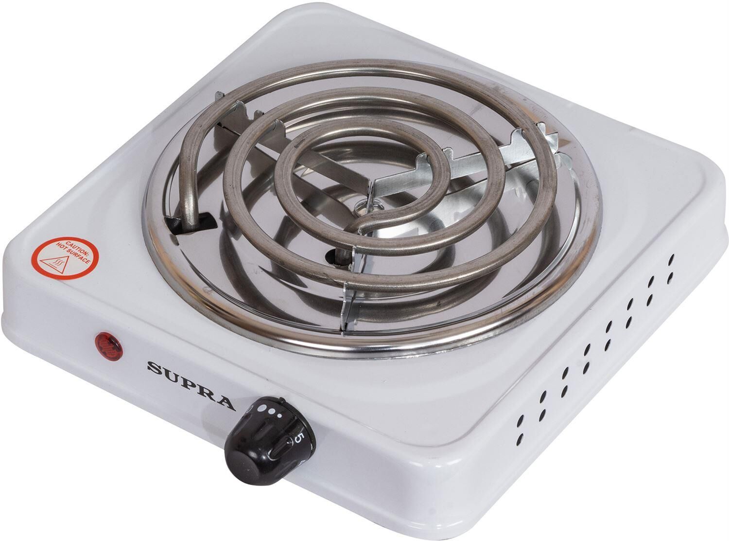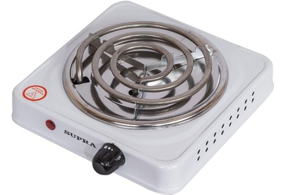 Электроплитка одноконфорочная. 1 спиралевый нагревательный элемент - 1000 Вт; корпус покрыт жаропрочной эмалью; плавное регулирование температуры конфорки; количество уровней мощности - 5; световая индикация, диаметр конфорки - 14.4 см; прорезиненные ножки.