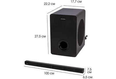 Совместимость с форматами: MP3/WMA/FLAC/WAV. Разделяемый центральный канал. Саундбар с проводным сабвуфером. Эквалайзер. Bluetooth. HDMI. Оптический вход. Полнофункциональный пульт ДУ. USB пор. Линейный вход. Максимальная выходная мощность: 200 Вт + Сабвуфер 400 Вт. Выходная мощность RMS: 30 Вт + Сабвуфер 50 Вт. Питание: DC 16.8 В, 3 А.