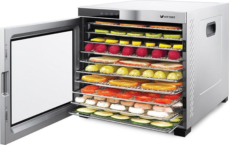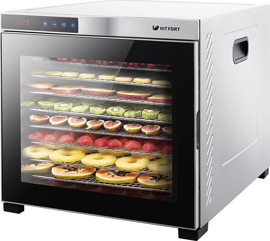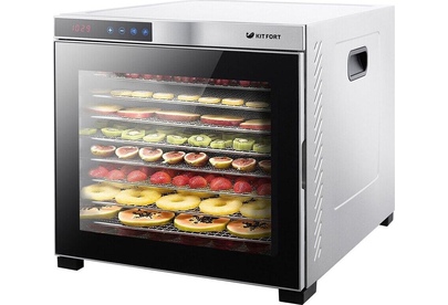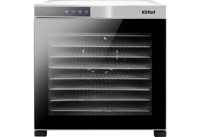 Электрическая сушилка Kitfort KT-1910 Professional Series предназначена для сушки овощей, фруктов, ягод, грибов, корнеплодов, трав и зелени, а также мяса и рыбы, хлеба. С помощью специального поддона для жидкости можно готовить пастилу. Сушилка имеет в комплекте 10 поддонов из нержавеющей стали, 1 поддон для жидкости и 1 сетку. В сушилке установлен мощный нагревательный элемент и вентилятор большого диаметра, обеспечивающий равномерное распределение нагретого воздуха по всему объему камеры. Благодаря горизонтальному обдуву смешение запахов при сушке одновременно разных продуктов минимально. На сушилке можно установить температуру сушки в диапазоне 35–75 °С с шагом 5 градусов. Сушилка оснащена таймером до 24 часов работы с шагом 30 минут.