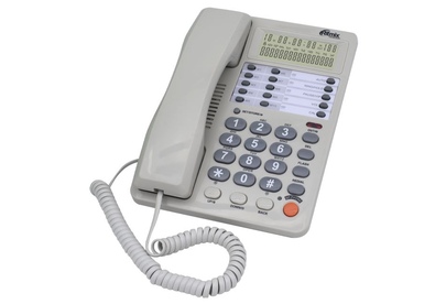 Проводной телефон с дисплеем. Совместимость с FSK/DTMF/ETSI с автоматическим определением, 16-разрядный ЖК-дисплей, 59 входящих и 16 исходящих звонков памяти, 10 кнопок для быстрого однокнопочного набора. Возможность подключения к мини АТС, перевод звонка. Функция повторного набора последнего номера. Будильник. Функция мелодии во время удержания звонка. Функция набора номера и разговора по громкой связи. Функция подсветки ЖК-дисплея. Пауза/сброс. Функция калькулятора. Функция отключения микрофона. Регулировка громкости динамика. Регулировка громкости звонка. Настенное / настольное размещение