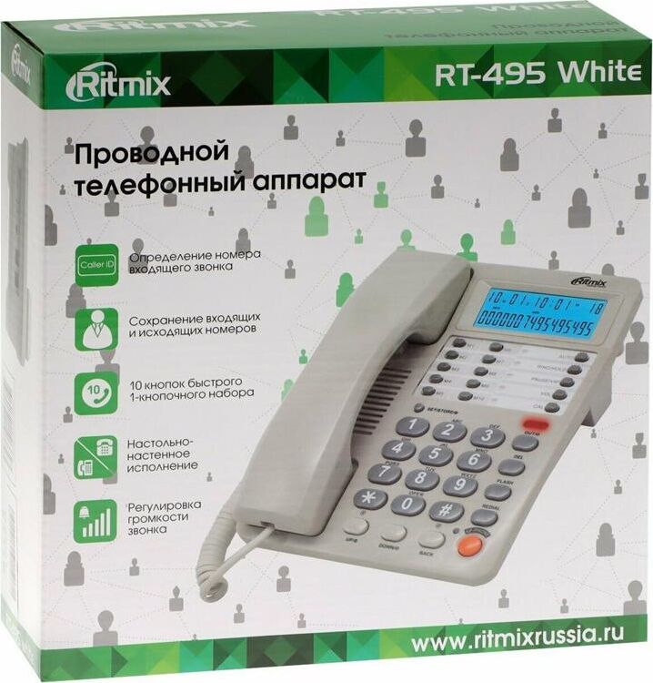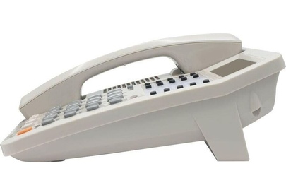 Проводной телефон с дисплеем. Совместимость с FSK/DTMF/ETSI с автоматическим определением, 16-разрядный ЖК-дисплей, 59 входящих и 16 исходящих звонков памяти, 10 кнопок для быстрого однокнопочного набора. Возможность подключения к мини АТС, перевод звонка. Функция повторного набора последнего номера. Будильник. Функция мелодии во время удержания звонка. Функция набора номера и разговора по громкой связи. Функция подсветки ЖК-дисплея. Пауза/сброс. Функция калькулятора. Функция отключения микрофона. Регулировка громкости динамика. Регулировка громкости звонка. Настенное / настольное размещение