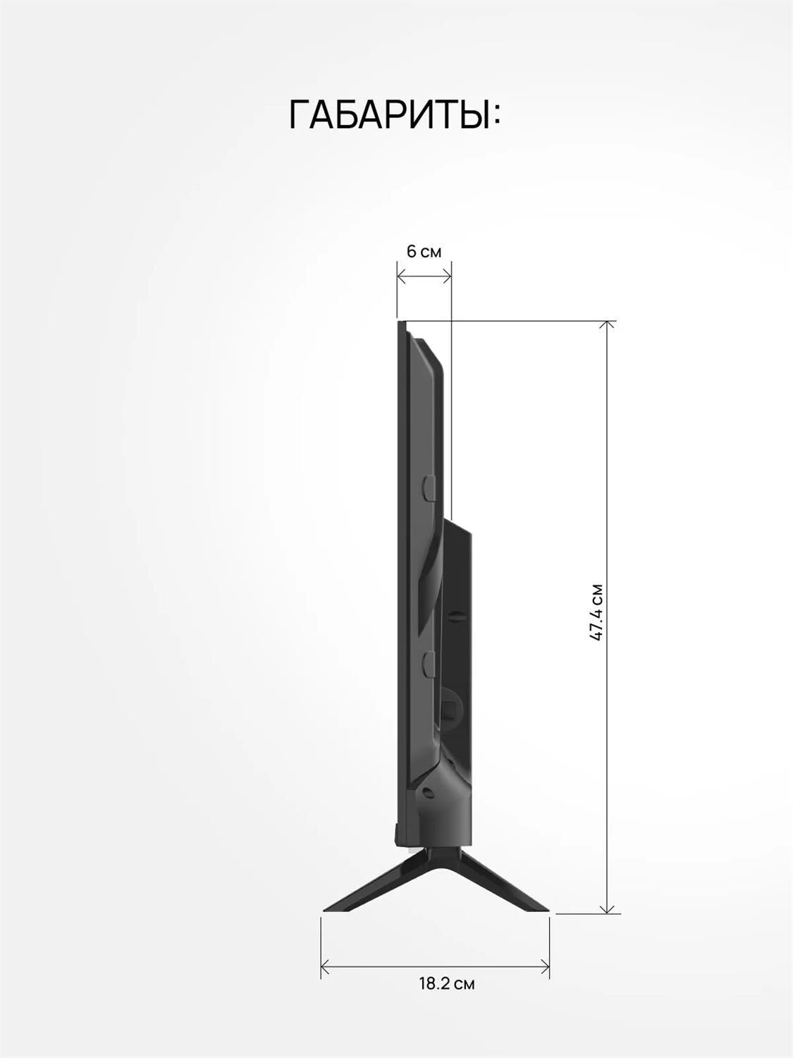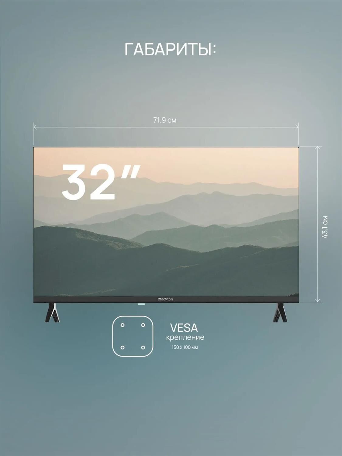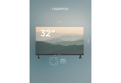 Диагональ экрана, дюймы 32″ Разрешение 1366x768 HD Тип подсветки Direct LED Частота обновления 60 Гц Число портов HDMI 3 Стандарт крепления VESA 100x150 мм Технология матрицы ТВ VA Гарантийный срок 1 год Тип Телевизор Цвет Черный, серый металлик, темно-серый Диагональ экрана, см 81.5 Изогнутый экран Нет Интерьерный телевизор Нет Стандарт разрешения HD Технология HDR Нет Мощность аудиосистемы, Вт 12 Сабвуфер Нет ТВ-тюнер DVB-C, DVB-T, DVB-T2 Встроенный медиаплеер Да Интерфейсы 3.5 мм, HDMI, USB Количество разъемов USB 2 Управление телевизором Пульт ДУ Мощность, Вт 60 Размеры, мм 719 x 474 x 182 Ширина, см 71.6 Высота, см 42.6 Размер без подставки (ШxВxГ), мм 719 x 431 x 60 Вес товара, г 3200