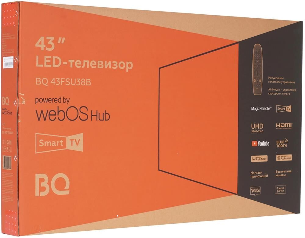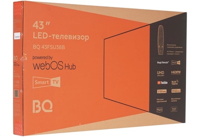 43" (109.22 см), DLED 16:9 UltraHD (3840*2160), 220 cd/m2 ±10%, 3500:1, тонкие рамки, Smart TV ОС webOS Hub7.0, Пульт Magic Remote AirMouse, Голосовое управление, Магазин приложений, Стриминговые сервисы, звук 16 Вт Box Spekers, , DVB-C/T/T2/S2, Bluetooth, 3 HDMI, 2 USB, VESA 100x100, подставка под телевизор, элементы питания, инструкция пользователя, гарантийный талон