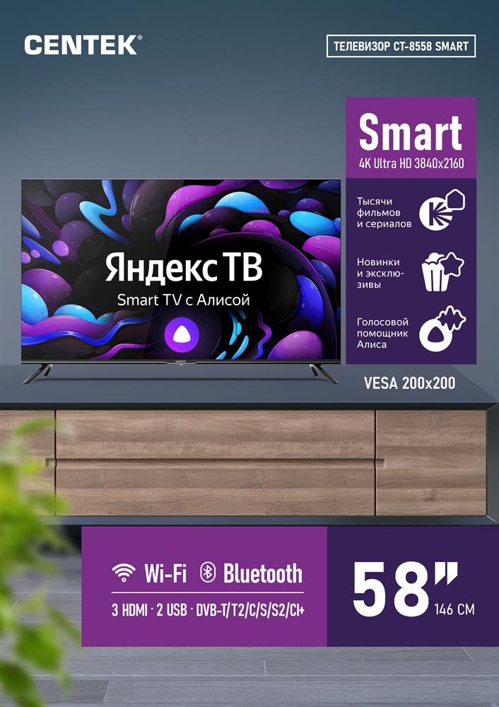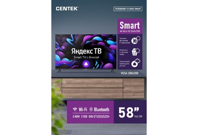 Диагональ 58’’ (4K). Разрешение 3840 х 2160. Контрастность 5000:1. Smart TV Есть. Яркость 280 кд/м2. Операционная система Android 9.0 (Yandex OS). Пульт ДУ С голосовым управлением. HDR Нет. Мощность 160 Вт. Мощность динамиков 10 Вт + 10 Вт. Угол обзора (L/R) 170/170. Крепление монтажа VESA 200 x 200. Входы и выходы LAN, 3хHDMI, 2хRF, COAX, MINI AV, 2хUSB, CI. Функции CEC, Родительский контроль, Спящий режим. Особенности Dolby/dolby+ surround, Динамическое шумоподавление, Мультиэкран, Таймер сна. Вес нетто 13,6 кг.