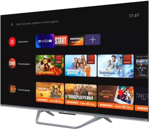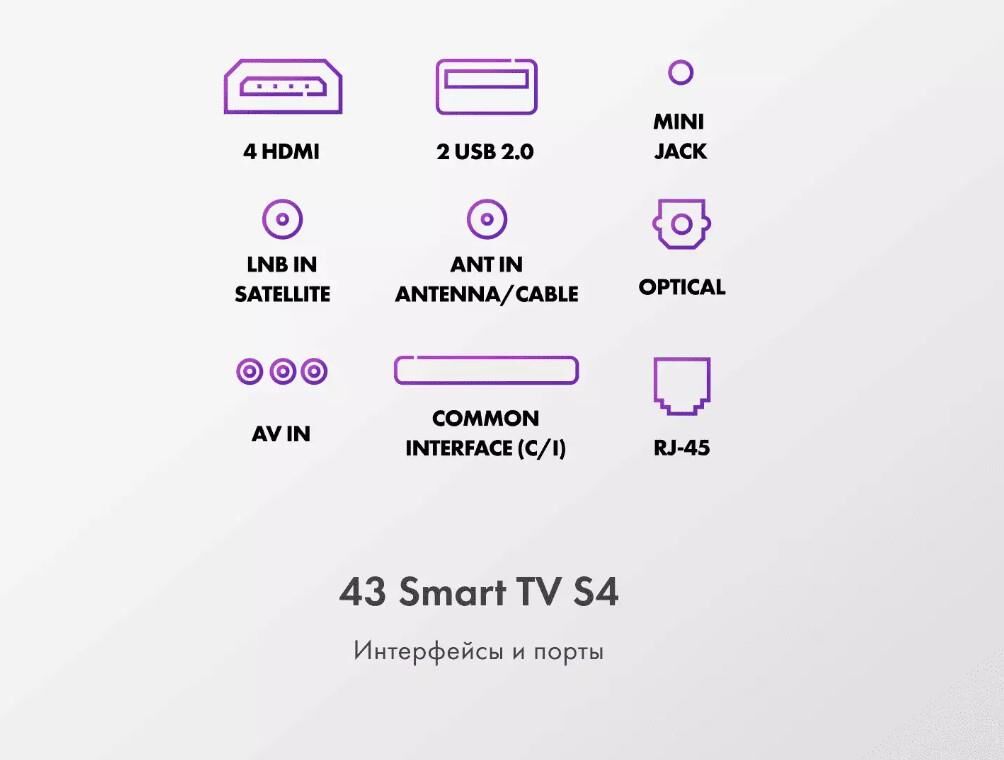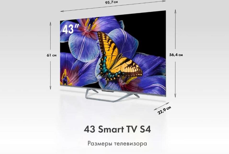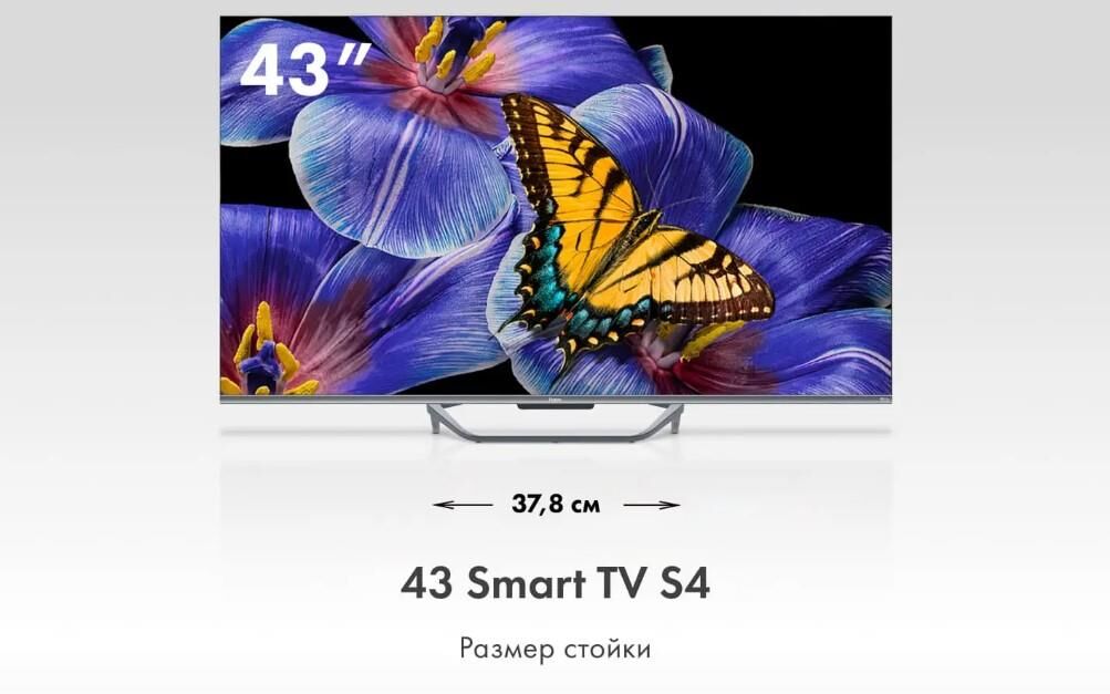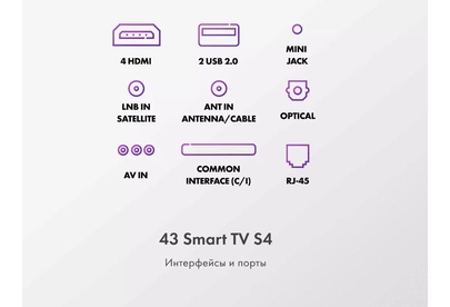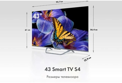 Smart TV Да Страна производства Россия Срок службы 5 лет Гарантия 3 года Серия ТВ S4 Экран Технология экрана HQLED Разрешение 4K UHD 3840 x 2160 Тип подсветки Direct LED Диагональ 43" Размер экрана (см) 109 Соотношение сторон 16:9 Частота обновления (Гц) 60 Время отклика (мс) 8 Яркость (кд/м²) 280 Статическая контрастность 4000:1 Угол обзора ° 178/178 SMART TV Операционная система Android TV 11.0 Поддержка YouTube Да Поддержка Google Play Store Да Голосовой поиск Да Wi-Fi® встроенный Да Версия Wi-Fi, ГГц 5 Ethernet вход 1 Bluetooth 5.1