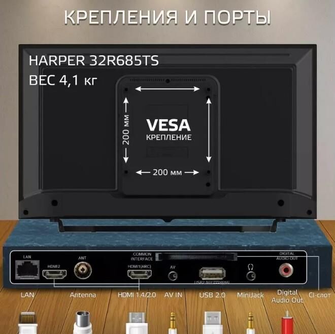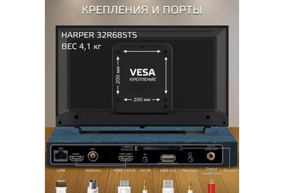 Диагональ экрана: 32 Разрешение: 1366x768 Разрешение экрана: HD READY Формат экрана: 16:9 Тип подсветки экрана: Direct LED Углы обзора: 176° Дизайн рамки: Frameless design Тип панели: VA Частота обновления экрана: 60 Гц Время отклика пикселя: 8 мс. Яркость: 230 Кд/м2 Контрастность: 3000:1 Количество цветов: 16,7 млн. Цветовой фильтр: RGB Цифровые тюнеры: DVB-T, DVB-T2, DVB-C Поддержка PAL: да Поддержка SECAM: да Поддержка NTSC: да Встроенная акустика: 12 Вт (2x6 Вт) Декодер стереозвука NICAM/A2: да Эквалайзер: да Объемное звучание: да Поддержка форматов изображений: JPEG, BMP, PNG Антенный вход: да Стереозвук: да Dolby audio: да Поддержка видеоформатов/кодеков: MPEG2, MPEG4, ASF, AVI, Xvid, FLV, MOV, VOB, MKV, HEVC Поддержка аудиоформатов/кодеков: AC3, EAC3, MP3, AAC, M4A, FLAC, OGG, WAV, WMA, Vorbis Разъемов HDMI: 2 Версия HDMI: 1.4 Количество разъемов USB 2.0: 1 Ethernet RJ-45: да Разъем для наушников: да Соединение по Wi-Fi 2,4 ГГц: да Поддержка CI: да Салют ТВ: да