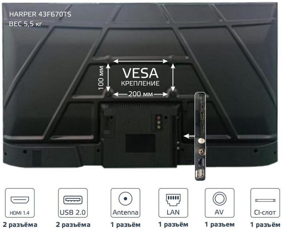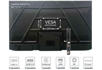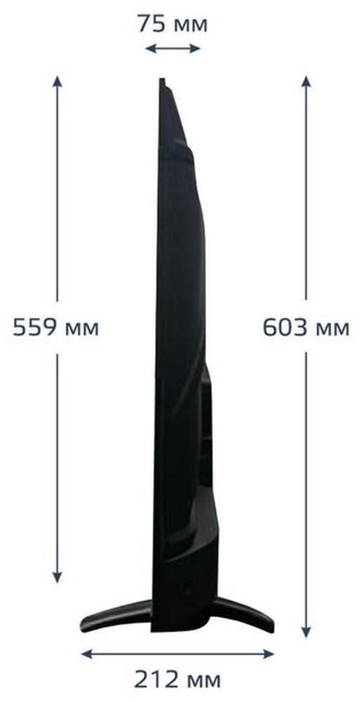 Телевизор.43" (109см)/ FULL HD 1920x1080/ SMART TV (AOSP 9.0) / цифровой тюнер DVB-T2/DVB-C/ Запись ТВ программ / Электронный Телегид/ Отложенный просмотр; слот CI+ для модуля условного доступа/ формат экрана: 16: 9/4: 3/auto/ Авто динамическая контрастность: 90000: 1 / Количество цветов 16,7 млн../ яркость: 250 кд/м2/ угол обзора (Г/В): 178°/178°/ время отклика: 8 мс/ Частота обновления экрана - 60Гц/ 3D цифровой фильтр/ ARM cortex –A55 quad core 1,1 GHz, Mail 470*3 600 MHz ( Оперативная память 1 Gb, Внутреняя память 8G) VESA 200 X 200 / русское; английское меню/ телетекст/ Внутреняя память 8G) входы: антенный /разъемы для подключения: 1 USB/ 3 HDMI/ Разъем для наушников jack 3,5 / Цифровой аудио выход /вход CI+ (common interface) / Встроенная акустика 16 Вт (2x8 Вт)