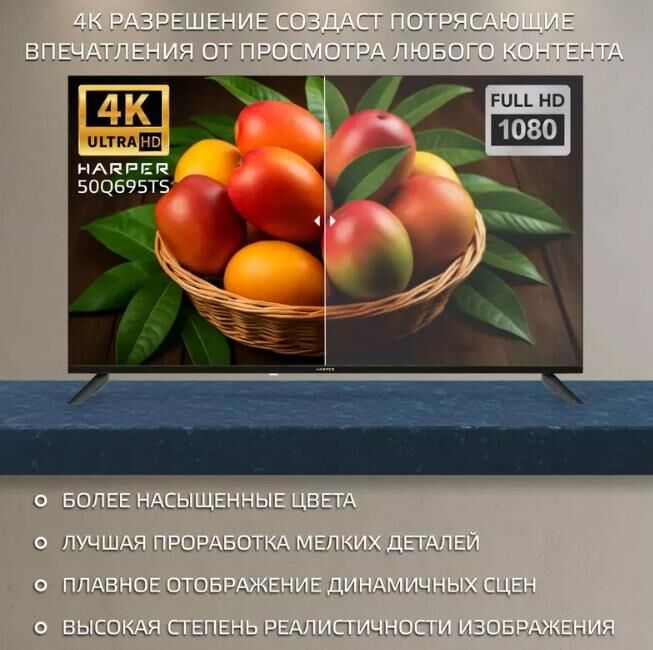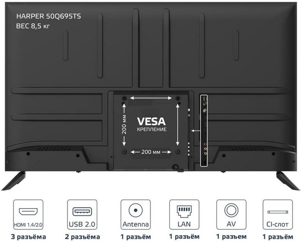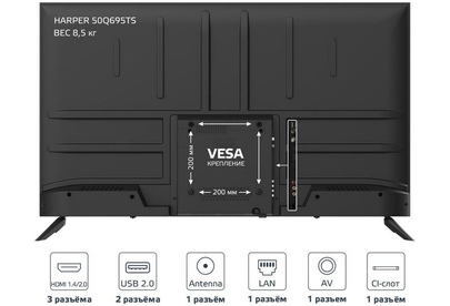 Диагональ экрана: 50 Разрешение: 3840х2160 Разрешение экрана: 4K UHD Функция HDR: да Формат экрана: 16:9, 4:3, Авто Тип подсветки экрана: QLED Углы обзора: 178° Дизайн рамки: Frameless design Тип панели: VA Частота обновления экрана: 60 Гц Время отклика пикселя: 8 мс Яркость: 280 Кд/м2 Контрастность: 120000:1 Количество цветов: 1 млрд. Цветовой фильтр: RGB Цифровые тюнеры: DVB-S2, DVB-T2, DVB-C Поддержка PAL: да Поддержка SECAM: да Поддержка NTSC: да Прием звука: да Встроенная акустика: 20 Вт (2x10 Вт) Декодер стереозвука NICAM/A2: да Эквалайзер: да Объемное звучание: да Поддержка форматов изображений: JPEG, BMP, PNG, MPO Стереозвук: да Антенный вход: да Dolby audio: да Воспроизведение с внешних носителей: да (NTFS, FAT 32) Запись на внешние носители: да (FAT 32) Поддержка видеоформатов/кодеков: MPEG2, MPEG4, AVI, Xvid, FLV, MOV, VOB, MKV, HEVC Поддержка аудиоформатов/кодеков: AC3, EAC3, MP3, AAC, M4A, WMA Разъемов HDMI: 3 Версия HDMI: 1.4/2.0 Количество разъемов USB 2.0: 2 Цифровой аудио выход: да Ethernet R