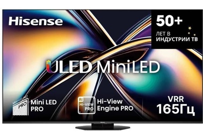 Hisense 65U8Q — 65-дюймовый 4K QLED телевизор Изображение Тип панели: VA Разрешение: 4K UHD (3840×2160) Подсветка: Mini LED Яркость (типичная): 450 нит Пиковая яркость: 600 нит Контрастность: 5000:1 Цветовой охват: 90% DCI-P3 Частота обновления: 144 Гц Поддержка HDR: Dolby Vision, HDR10, HDR10+, HLG, Dolby Vision IQ Функции улучшения изображения: AI 4K Upscaler, MEMC, Filmmaker Mode Игровые возможности Режим HDR для игр: Да FreeSync Premium: Да VRR: 48–144 Гц ALLM: Да Игровой режим: 144Hz Game Mode PRO Input Lag: ~13 мс Дополнительно: Game Bar Аудио Акустика: 2.0.2 канала (2×10 Вт + 2×8 Вт) Поддержка: DTS Virtual X, AC-4, NICAM/A2 Dolby Atmos: Нет Сабвуфер: Нет Смарт-функции Платформа: VIDAA U9 Голосовые помощники: Amazon Alexa (встроенный), Vidaa Voice Поддержка AirPlay 2, Screen Sharing, контент с Android Браузер: Да (Odin) HbbTV: 2.0.4 Подключения Wi-Fi: 802.11 a/b/g/n/ac (2.4G/5G) Bluetooth: 5.0 HDMI: 4 порта (все HDMI 2.1, включая eARC, VRR, ALLM) USB: 1×USB 3.0, 1×USB 2.0 CI+