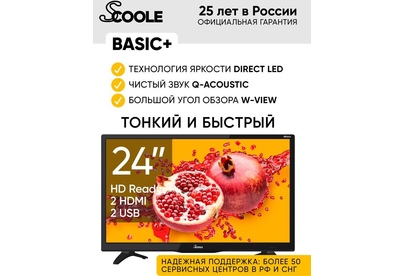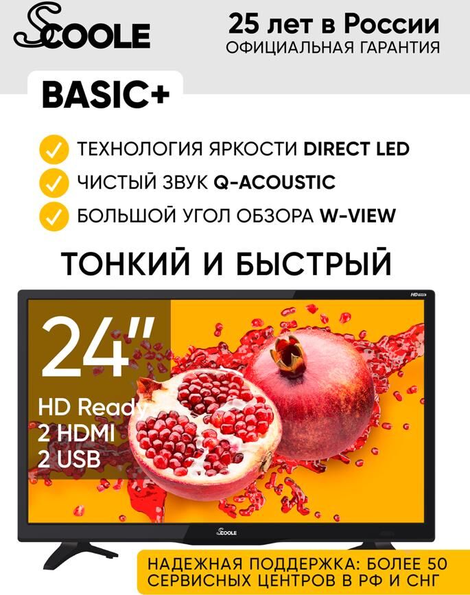 Светодиодная подсветка (LED) Диагональ экрана: 60 см Разрешение экрана: 1366 x 768 пикселей Прием аналогового сигнала: PAL/SECAM Прием цифрового сигнала DVB-T2/T/C Воспроизведение аудио-, фото- и видеофайлов через USB Стереозвук NICAM Прогрессивная развертка Рабочее напряжение: ~100–240 B, 50 Гц Цвет: черный