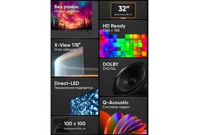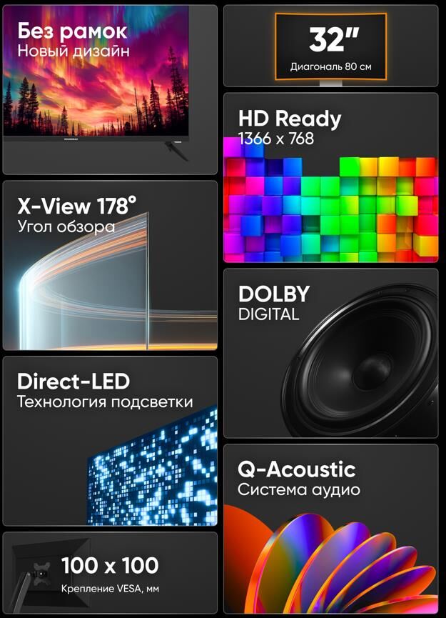 Светодиодная подсветка (LED) Диагональ экрана: 80 см Разрешение экрана: 1366 x 768 пикселей Прием аналогового сигнала: PAL/SECAM Прием цифрового сигнала DVB-T2/T/C Воспроизведение аудио-, фото- и видеофайлов через USB Стереозвук NICAM Прогрессивная развертка Рабочее напряжение: ~100–240 B, 50 Гц Цвет: черный