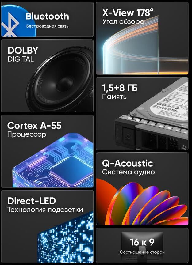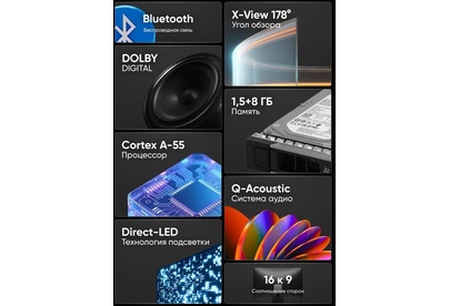 • Разрешение: 4K (3840 x 2160) безрамочный • Стандарты вещания: DVB-T/T2/C/S/S2 • Разъемы: HDMI, HDMI (ARC), USB, встроенный CI–интерфейс, композитный вход, разъем для подключения наушников (3.5 мм), аудиовход (3,5мм), компонентный видеовход (3,5мм), VGA (D-Sub) вход, Ethernet (RJ45), цифровой коаксиальный аудиовыход, аудиовидео вход (3,5мм) • Тип подсветки: D-LED • Частота обновления: 60 Гц • Соотношение сторон: 16:9 • Версия Android: Android 11 (OS Family) • Подключение к интернету: Wi-Fi и Ethernet • VESA 200х100