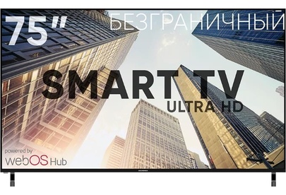 Диагональ дисплея 75" (190 см). Разрешение 3840 х 2160. Тип экрана Безрамочный. Яркость (кд/м2) 280. Контраст 1200:1. Время отклика (мс) 8. Технологии изображения HDR. Формат 16:9. Углы обзора (верт. х гориз.) 178 х 178. Поверхность Глянцевая. Стандарт вещания DVB-T / DVB-T2 / DVB-C / DVB-S / DVB-S2 / Аналоговый. Системы звука BG / DK / I. Система цветности PAL / SECAM. Операционная система WebOS 2.0. Процессор ARM Cortex-A55, 2 адра + ARM Cortex-A75, 2 ядра, 1.0 ГГц. Графический процессор IMG BXE-4-32-MC1, 700 МГц. Оперативная память 1.5 ГБ. Встроенная память 8 ГБ (часть встроенной пямяти занимает ОС). Wifi 2,4 ГГц. Bluetooth 5.0. Порт Ethernet (LAN) 10/100 Мбит. Питание ~110-240 В. Настенное крепление VESA 600 х 400. Мощность динамиков 2x8 Вт. Цвет черный.
