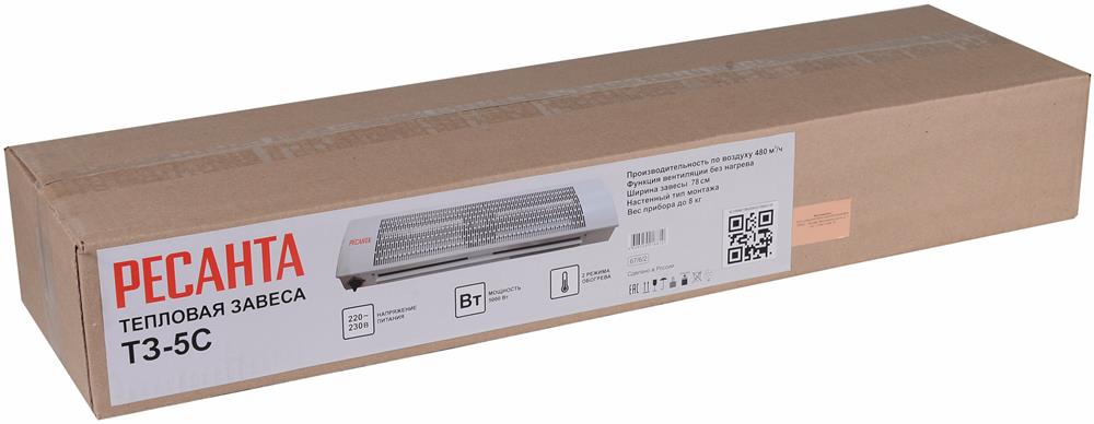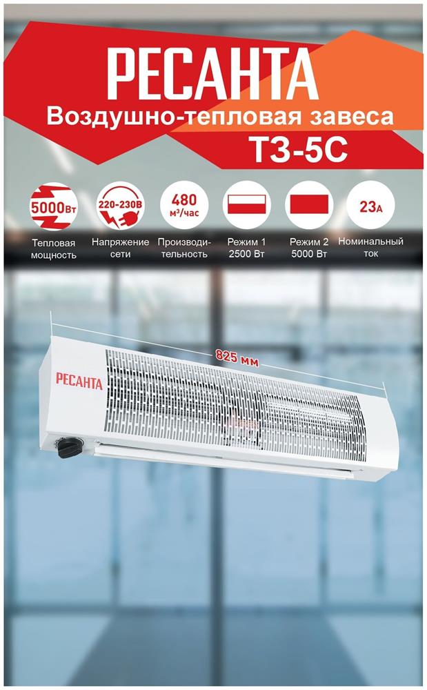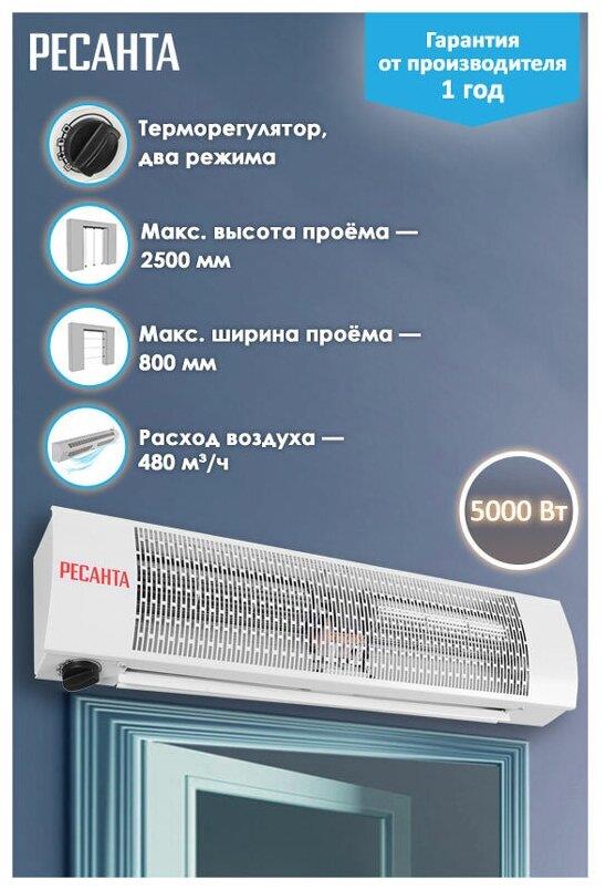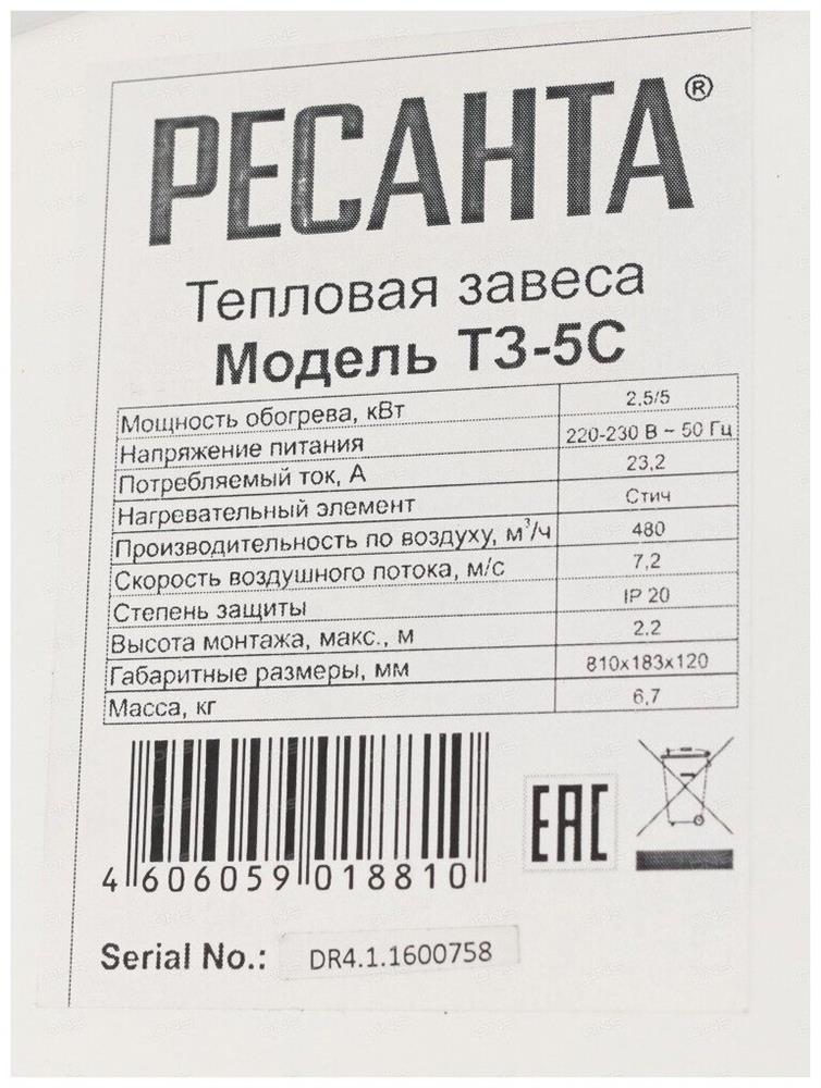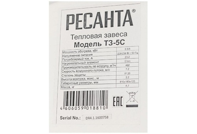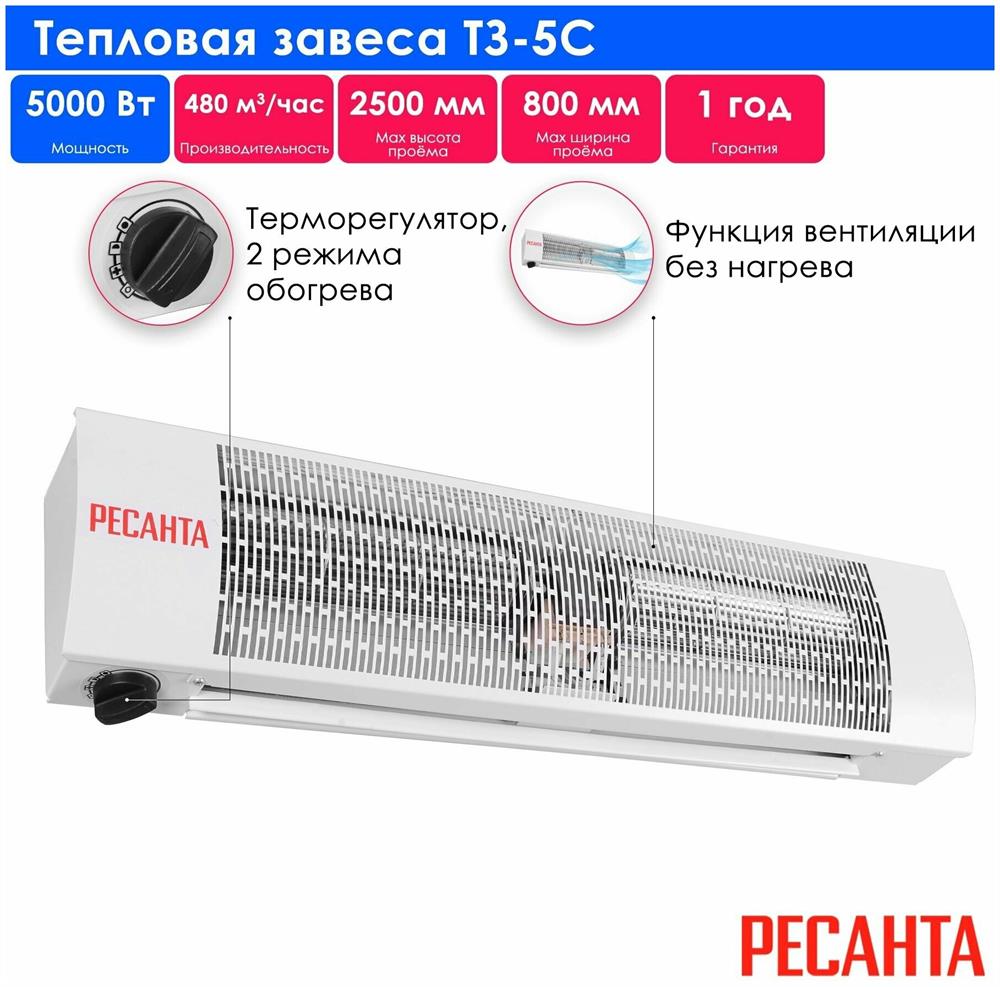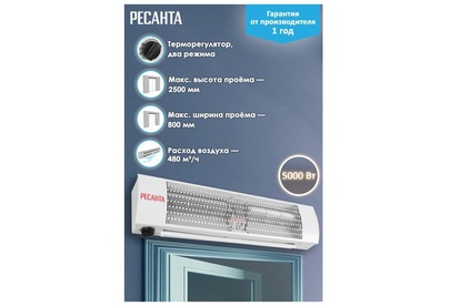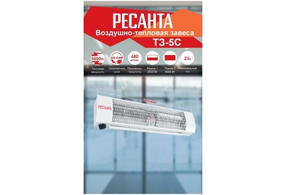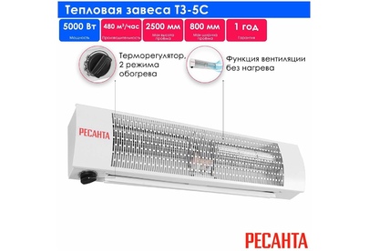 Тепловая завеса РЕСАНТА ТЗ-5С Мощность, Вт - 5000; Площадь обогрева, м2 - 50; Напряжение сети, В - 220; Гарантия, Мес - 12; Страна бренда - Латвия