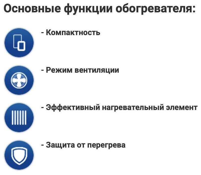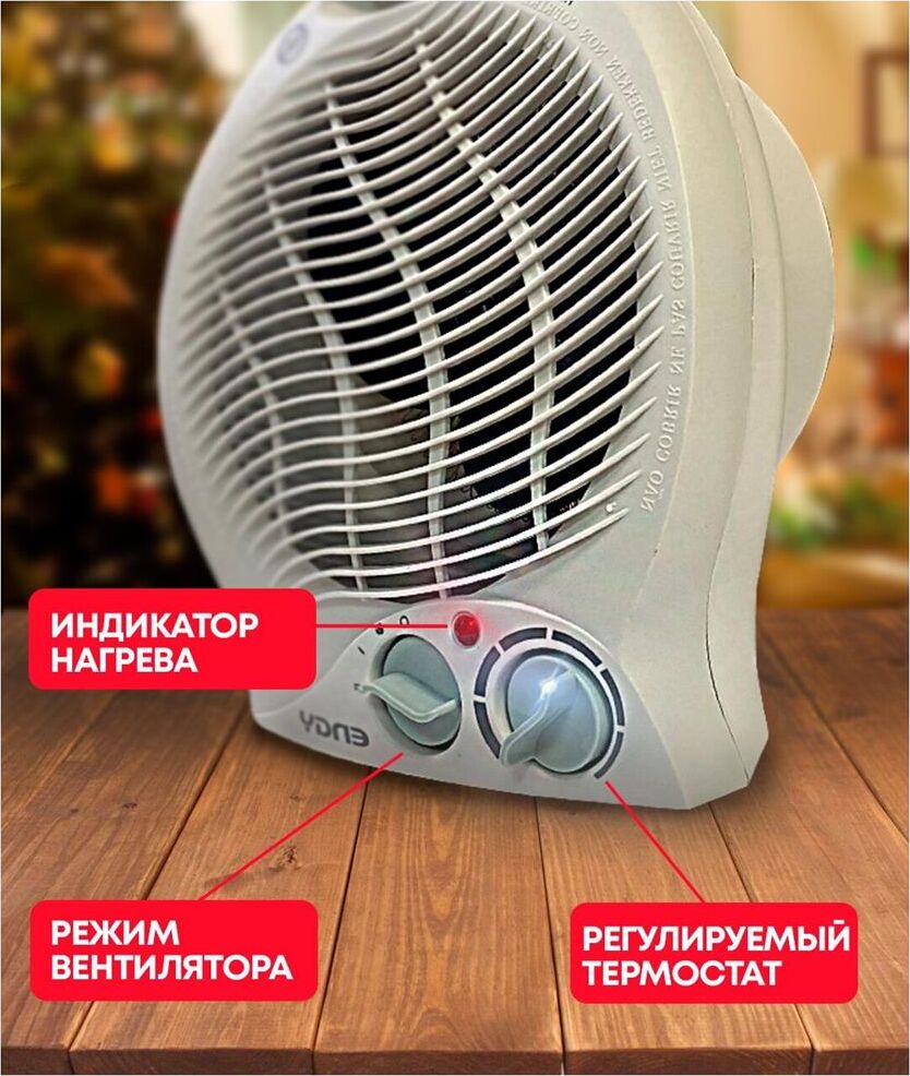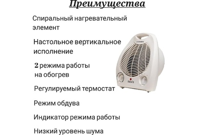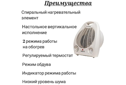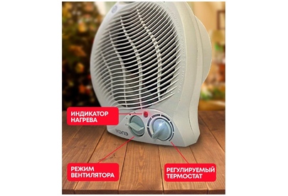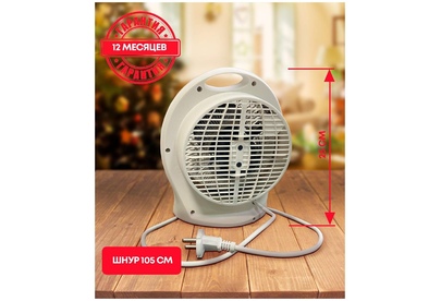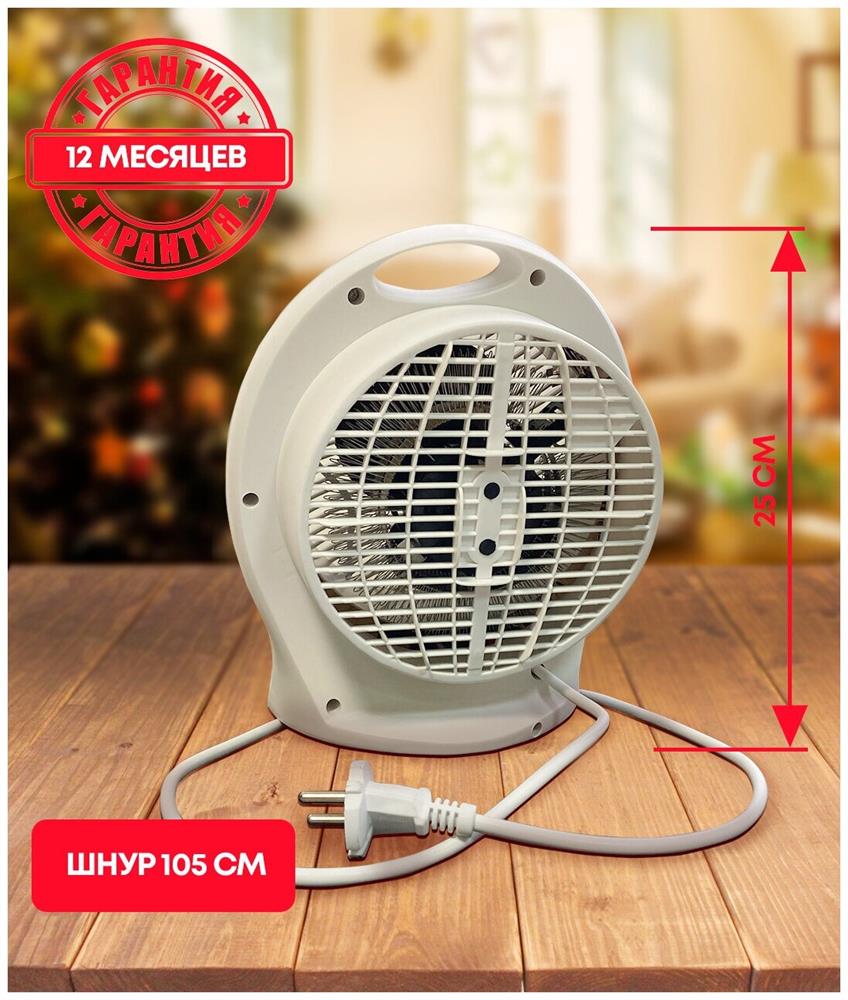 Мощность, Вт 2000 Мощность по ступеням, Вт 1000/2000 Номинальное напряжение, В 220-240 Номинальная частота, Гц 50 Номинальная сила тока, А 8,4 Площадь обогрева, м2 до 20 Класс защиты II Степень защиты IPX0 Длина шнура, м 1 Размер изделия, см 23х21х11 Вес, кг* 0,85. Спиральный нагревательный элемент Настольное вертикальное исполнение 2 режима работы на обогрев Регулируемый термостат Режим обдува Защита от перегрева Индикатор режима работы Компактность Низкий уровень шума