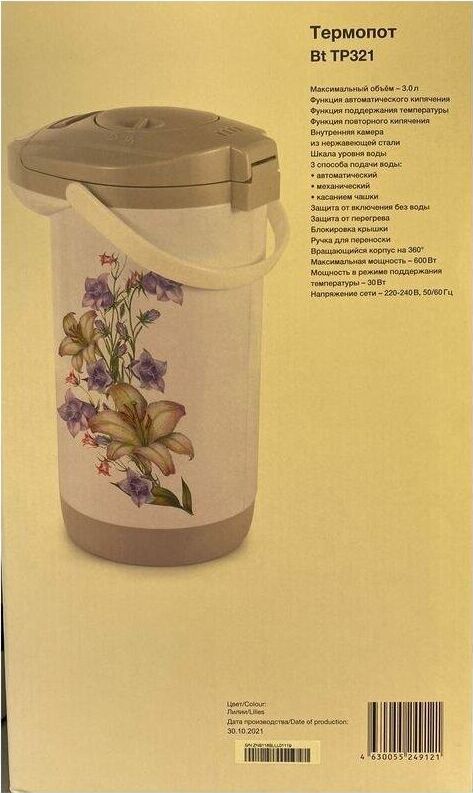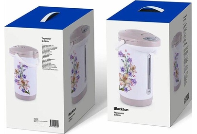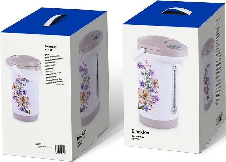 BLACKTON BT TP321 Белый-Серый с лилиями Мощность 600 Вт Объем 3 л Поддержание температуры 3 способа подачи воды Защита от включения без воды Защита от перегрева Вращающийся корпус на 360° Внутренняя колба из нержавеющей стали Ручка для переноски