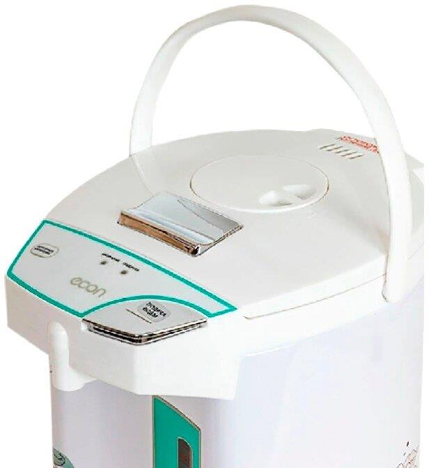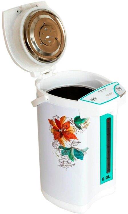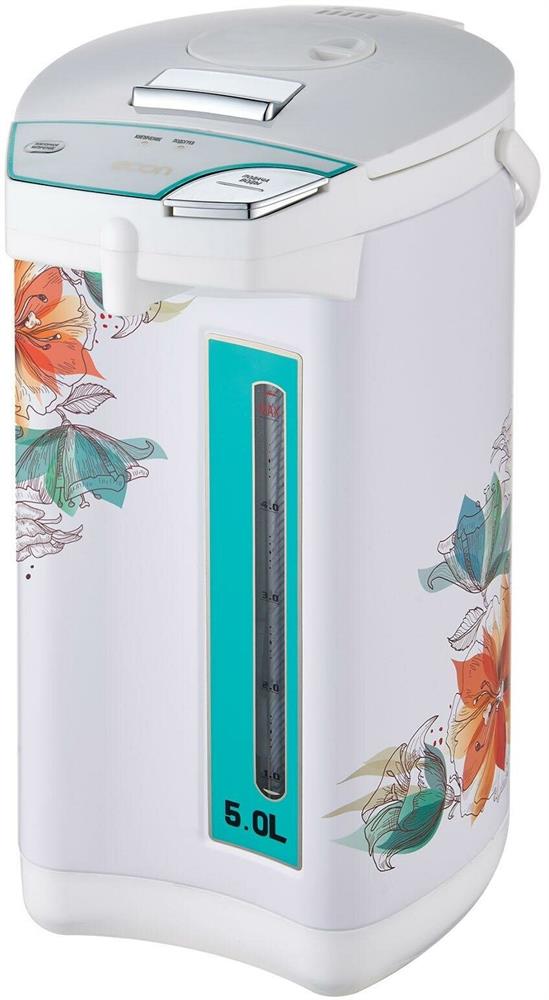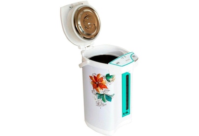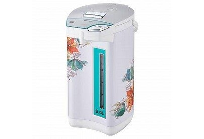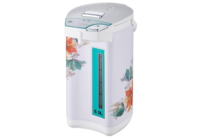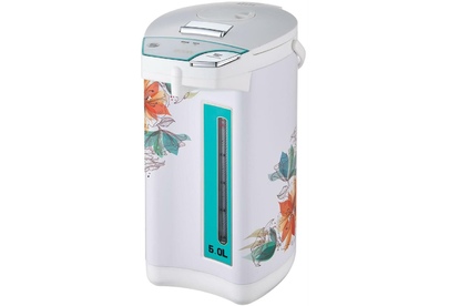 Термопот электрический, Мощность 750Вт, Объем 5 литров, Способ подачи воды - механический, электрический, касанием чашкой, Защита от перегрева, Защита от перепада напряжения, Функция повторного кипячения.
