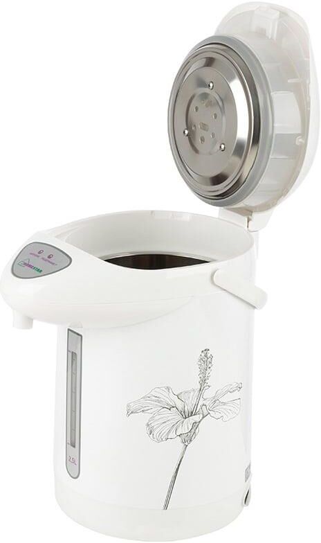 Мощность 750 Вт. Объём 2,5 л. Мощность в режиме поддержания температуры: 35 Вт. 1 способ подачи воды: ручной. Скрытый нагревательный элемент. Нерж. стальная колба. Съёмный шнур питания. Функция поддержания температуры 24ч. Материал: металл, пластик.