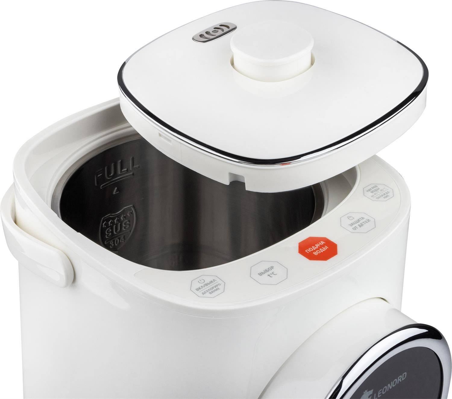 Мощность 1200 Вт Объем 5 л LED дисплей с указанием температуры Функция повторного кипячения Установка нагрева воды до температуры 45/55/65/75/85/95°C Система быстрого охлаждения Функция "замок" (защита от детей) Две системы нагрева подходят для кипячения водопроводной и очищенной воды Два способа наливания воды (когда термопот подключен к сети и когда выключен) Внтренняя колба нержваеющая сталь 304#, снаружи пластик Защита от перегрева и при работе без воды Длина шнура 1,2 м (медный)