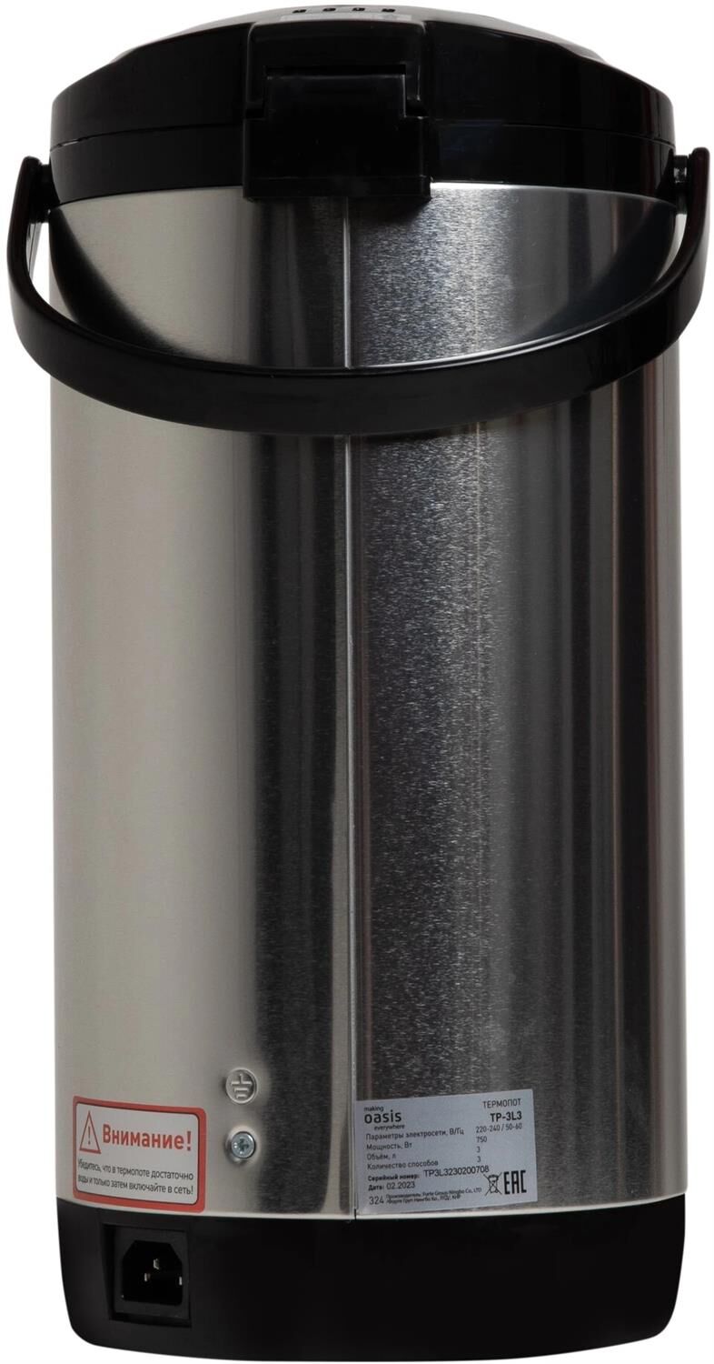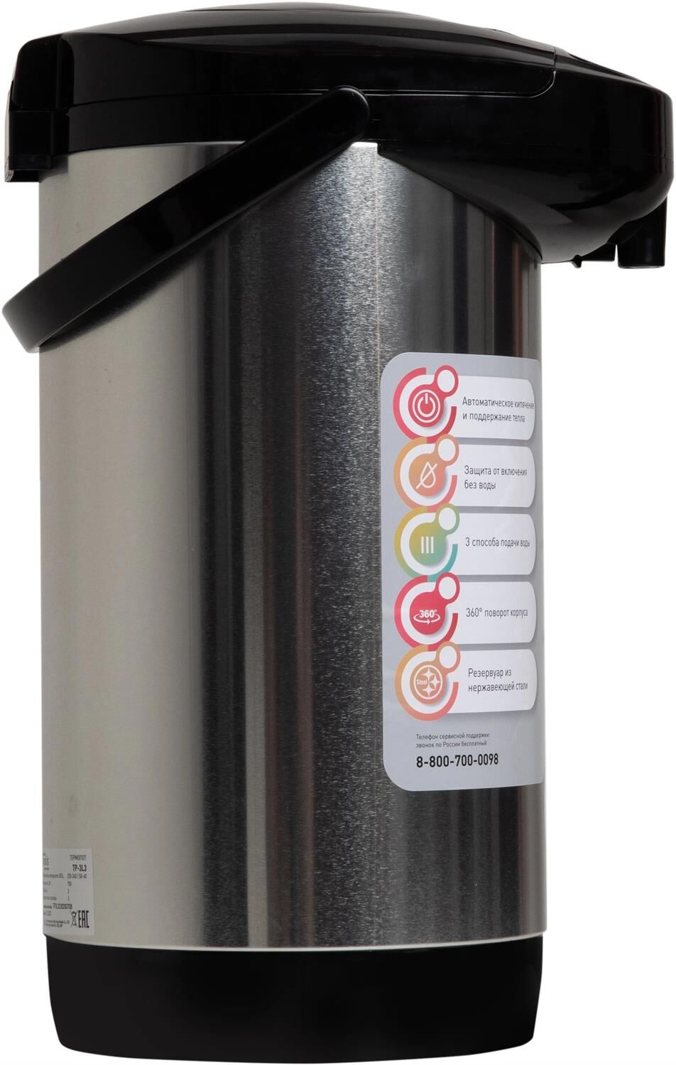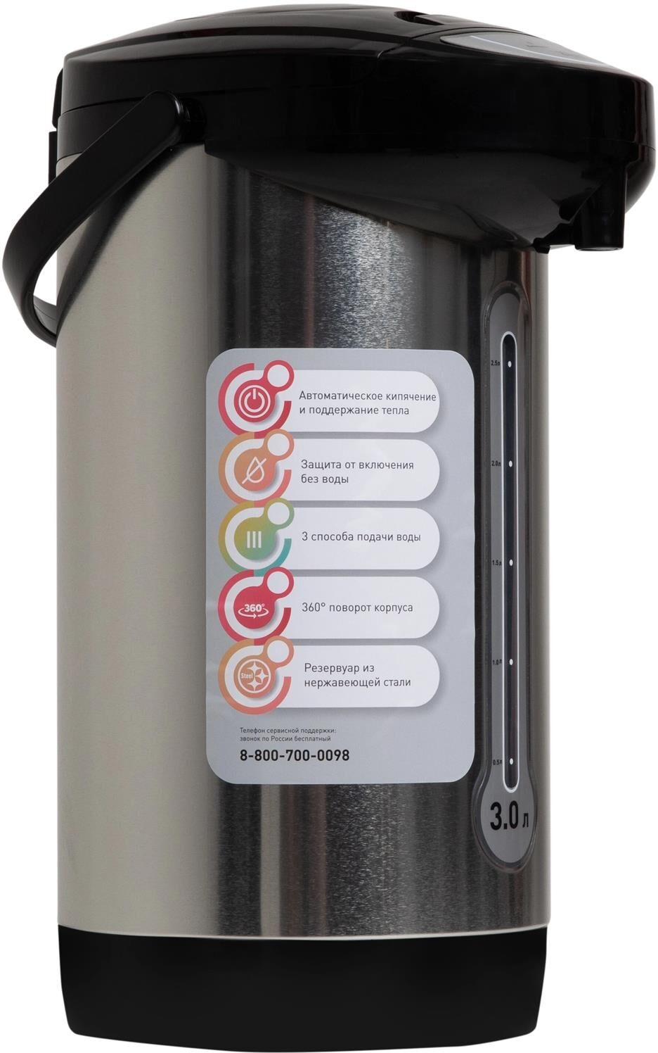 Мощность, Вт 800 Объем, л 3 Способы подачи воды 3 Цвет стальной+черный Тип управления кнопочное Материал корпуса сталь+пластик Материал колбы нержавеющая сталь Длина кабеля, см 75 Размер изделия, см 29,5?21?36 Вес нетто, кг 1,78