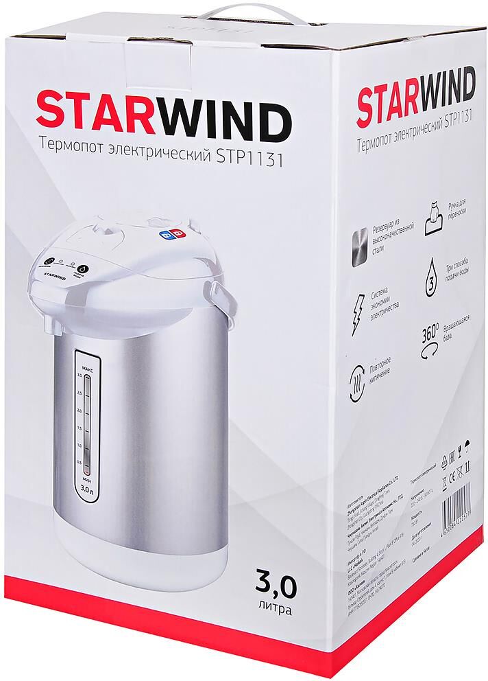 Мощность 750 Вт Объем 3 л 2 температурных режима Температурные режимы 100/85-95 °С Время закипания 30 мин Защита от перегрева Отключение при закипании Функция повторного кипячения Съемная крышка Индикатор уровня воды Вращающийся корпус на 360° Ручка для переноски Поддержание температуры воды Скрытый нагревательный элемент Цвет белый Срок гарантии 12 мес