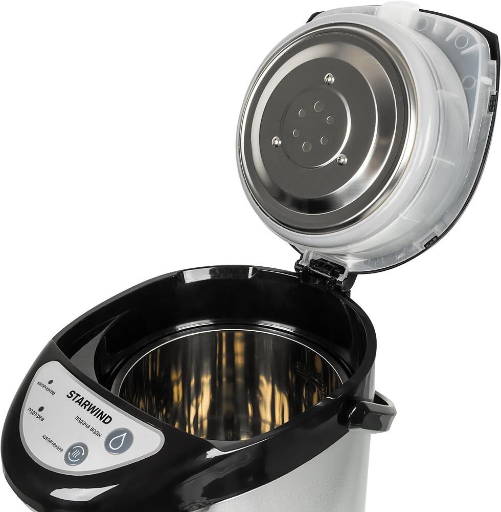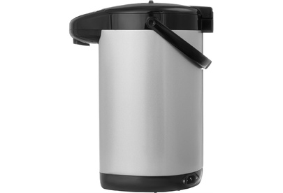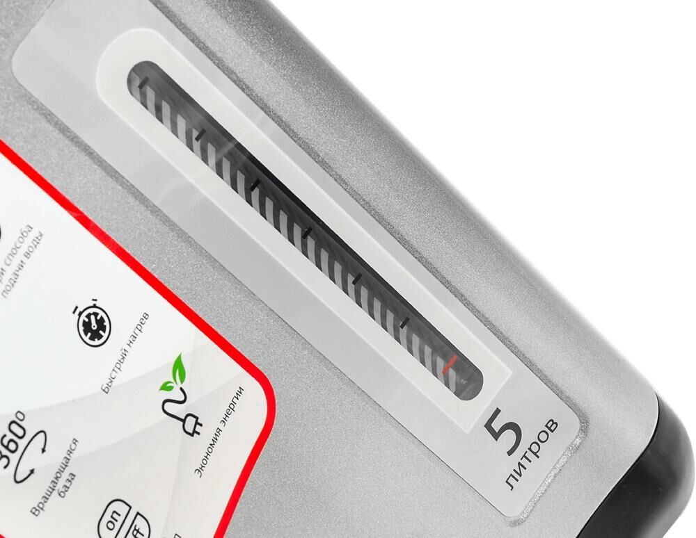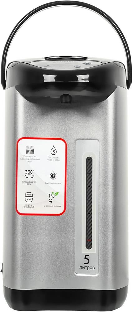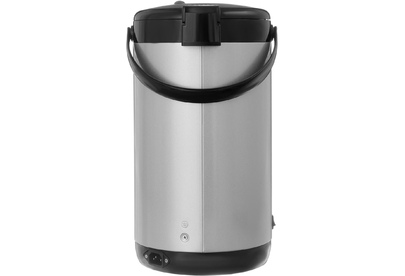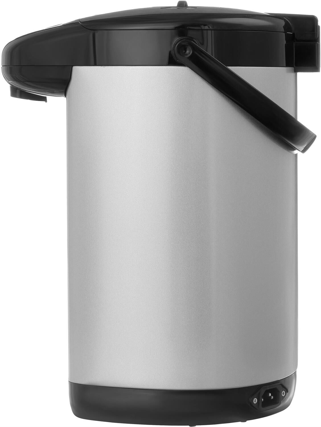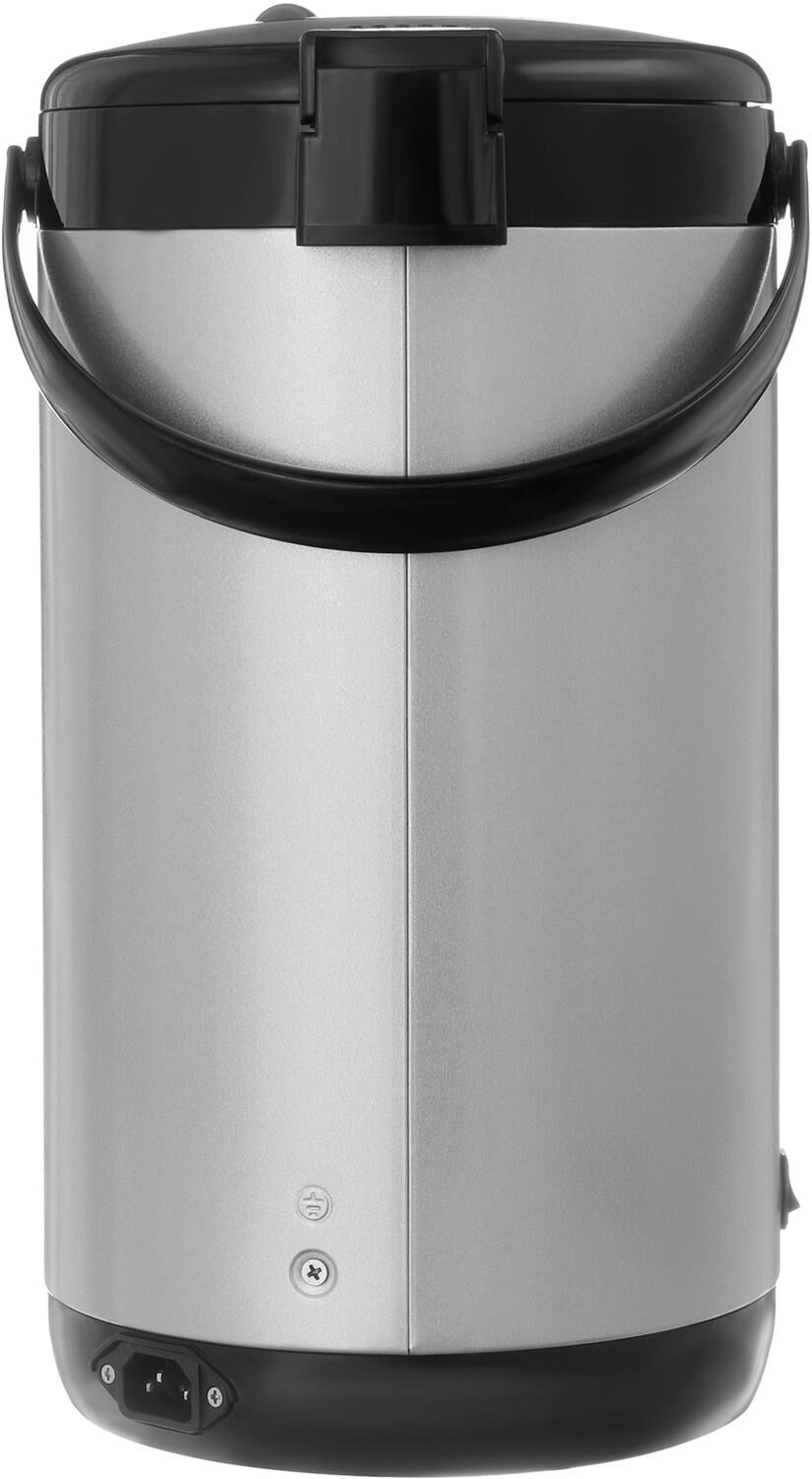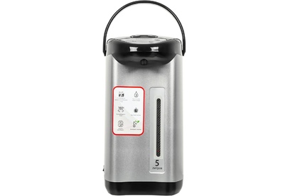 Мощность 750 Вт Объем 5 л Скрытый нагревательный элемент Функция повторного кипячения Съемная крышка Индикатор уровня воды Индикация включения Вращающийся корпус на 360° Ручка для переноски Поддержание температуры воды Материал корпуса - нержавеющая сталь Цвет черный и серебристый Срок гарантии 12 мес