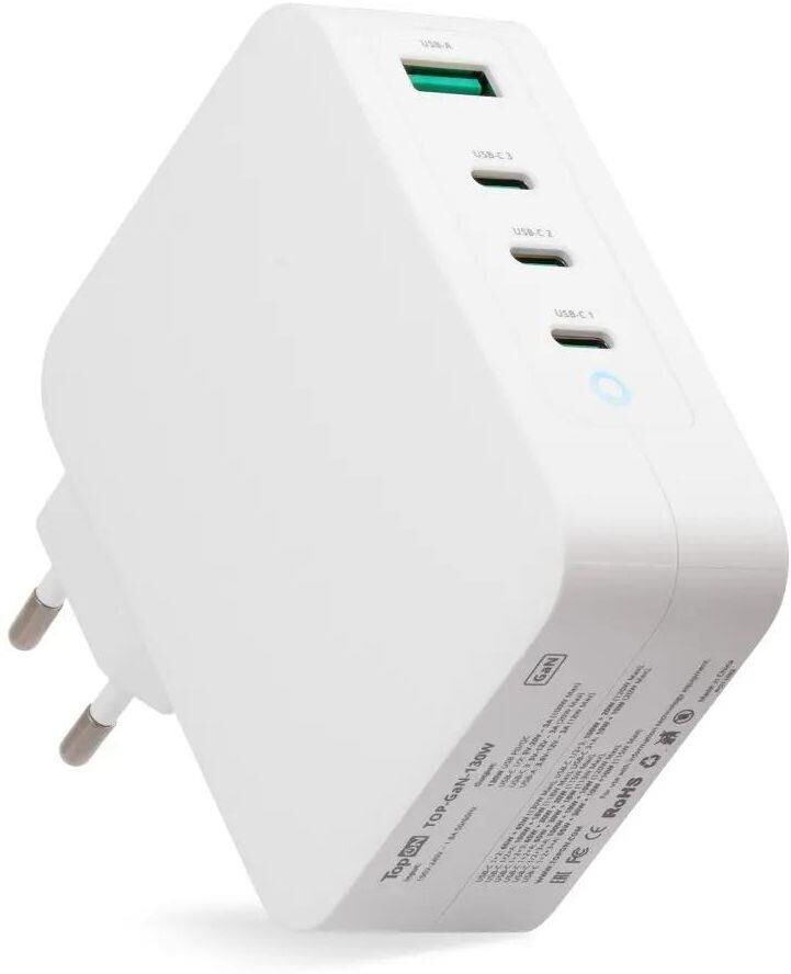 Выходная сила тока: 5 A Тип: Блок питания Тип электропитания: от бытовой электросети Тип переключателя выходного напряжения: автоматический Наличие индикации: LED индикатор Выходное напряжение: 5-20В Модель: TOP-GaN-130W Выходная мощность: 130 Вт Частота электросети: 50 - 60 Гц Входное напряжение: 100-240В Цвет: белый Материал корпуса: пластик Ширина товара: 87 мм Высота товара: 68 мм Глубина товара: 33 мм Вес товара: 290.6 грамм PartNumber/Артикул Производителя: 103208 Совместимость: универсальный Особенности: Зарядный кабель продаётся отдельно. 3 универсальных USB-C и USB-A, LED индикатор. На основе нитрида галлия (Gallium Nitride, GaN). Высокая энергоэффективность, низкое тепловыделение, автоматический подбор напряжения и силы тока. Поддержка Power Delivery 3.1, PPS и QC 4.0. Описание: Система распознавания и защиты устройства
