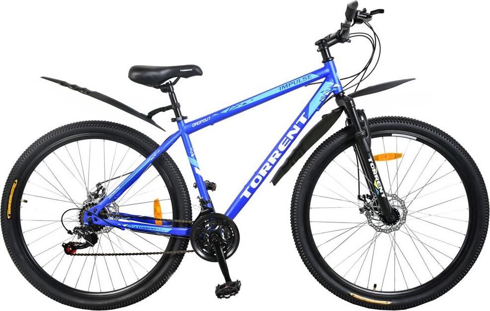 Велосипед TORRENT Impulse подходит для езды по выделенным городским велодорожкам, пересеченной местности, а также сельских и загородных прогулок. Рама классическая алюминиевая. Велосипед имеет такую конструкцию, которая позволяет перемещаться по дорогам со сложным рельефом (ямы, горки, пологие спуски). Комфортность езды достигается за счет гашения передним амортизатором толчков и вибраций, образующихся при столкновении колес с препятствием. Дисковые тормоза обеспечивают надежное торможение. Сиденье средней мягкости регулируется по высоте. Фиксация высоты сиденья происходит с помощью ручного зажима «Quick release». Велосипед оснащен светоотражателями, боковым задним упором для парковки, защитой передних звёзд и пластиковыми крыльями. Вес велосипеда 16кг. Категория: MTB Рама (материал): сталь Размер рамы: 18? Диаметр колес: 29? Количество скоростей: 21 Вилка передняя: амортизационная Амортизатор задний: нет Система: LYD Кассета (блок звезд): SAIGUAN Переключатель скоростей передний: SHIMANO Tourney Переключател