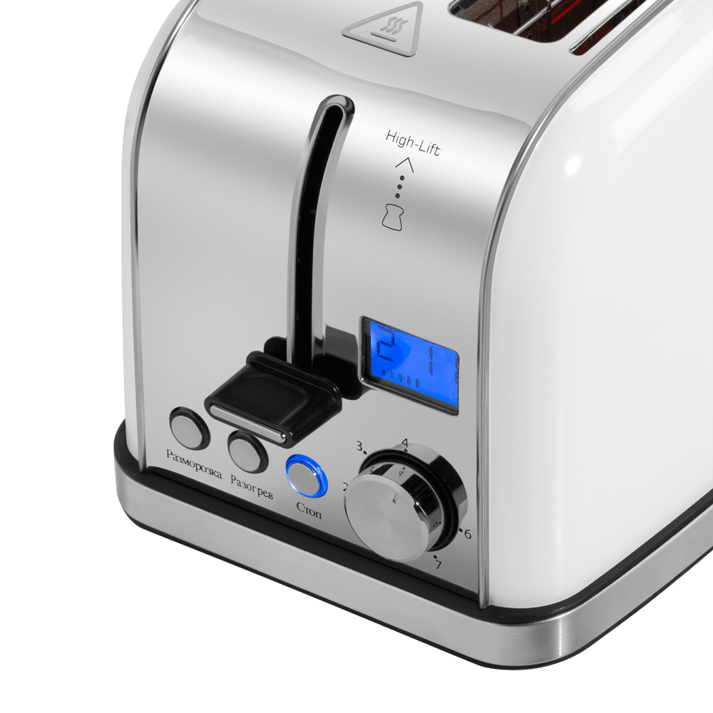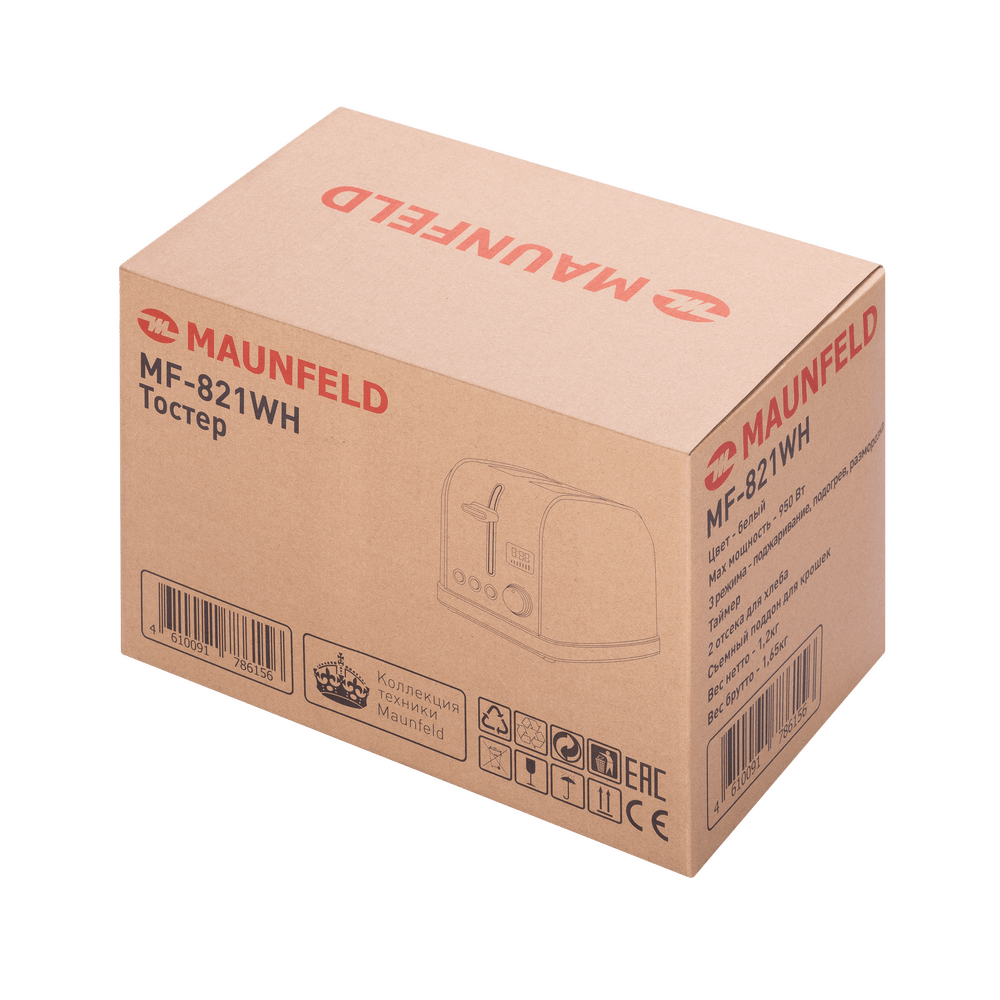 Тостер Maunfeld MF-821WH заявлен в классическом белом цвете. Корпус прибора сделан из нержавеющей стали. Устройство имеет два отсека для тостов. А также 3 режима работы, которые регулируются с помощью кнопок с LED-подсветкой. Модель может предложить 7 возможных степеней обжарки, благодаря этому можно делать тосты из разных сортов хлеба. Ключевые преимущества: Два отсека для тостов 3 режима работы 7 степеней обжарки