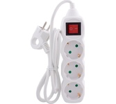 Колодка на 3 розетки Длина провода 1,5 м. Провод ПВС с сечением 3х0,75 мм2. Заземление Кнопка включения Защитные шторки от детей Макс нагрузка 2200 Вт Сила тока 10 А Эргономичная вилка Материал - негорючий, ударопрочный РР-пластик. Корпус неразборный. Цвет-белый