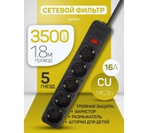 Cетевой фильтр, количество розеток - 6 (евростандарт с заземлением), номинальный ток нагрузки - 10А, номинальное входное напряжение - 220В, корпус из ударопрочного негорючего материала, длина кабеля - 5,0 м.