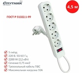 5 мест, тумблер питания со светодиодной индикацией, корпус из высококачественного пластика, трехжильный кабель ПВС, длина кабеля: 4,5 м, номинальное напряжение: 220 В, рабочая частота: 50–60 Гц, суммарная мощность нагрузок: 2,2кВт.