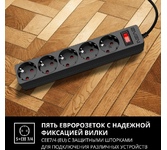 Выключатель со световой индикацией Автоматический предохранитель для отключения при перегрузках и КЗ Варисторная защита от высоковольтных импульсных помех Защитные шторки на розетках Пять евро розеток CEE7/4 (EU) с надежной фиксацией вилок любых типов Возможность настенного крепления в любом положении Максимально допустимая нагрузка 2300 Вт Макс. подавляемая энергия высоковольтных импульсов, Дж ? 150 Номинальное напряжение, В ~ 250 Рабочая частота, Гц 50 Выходные розетки 5 ? СЕЕ 7/4 Ток срабатывания термопредохранителя, А >10 Длина кабеля, м 3,0