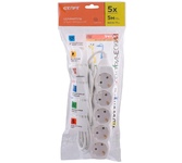 Колодка на 5 розеток Длина провода 5 м. Провод ПВС с сечением 3х0,75 мм2. Заземление Макс нагрузка 2200 Вт Сила тока 10 А Эргономичная вилка Материал - негорючий, ударопрочный РР-пластик. Корпус неразборный. Цвет-белый