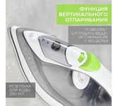 Покрытие подошвы- Enviro ceramic Система защиты от накипи Система автоматического отключения Вертикальное отпаривание Постоянная подача пара Противокапельная система Шарнирное вращение шнура на 360 °С Мощность: 2400 Вт Паровой удар: 160 г/мин Объем резервуара: 250 мл Удлиненный сетевой шнур: 2м Напряжение: 220-240 В, 50/60 Гц