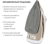 2600 Вт, резервуар д/воды 450 мл, подошва керамика (242х130 мм), регулируемый термостат, функция анти-капля, распылитель воды, регулятор интенсивности пара, вертикал.отпаривание, паровой удар, автоочистка, мерн. стакан, общая длина шнура питания 1,9 м