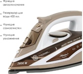 2600 Вт, резервуар д/воды 380 мл, подошва керамика (236х125 мм), регулируемый термостат, функция анти-капля, распылитель воды, регулятор интенсивности пара, вертикал.отпаривание, паровой удар, автоочистка, мерн. стакан, общая длина шнура питания 1,9 м