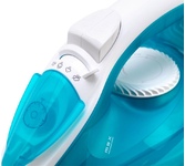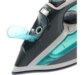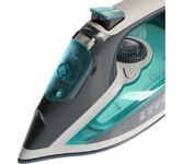 Мощность 2600Вт, резервуар для воды 400мл, керамическая подошва (233х122 мм), сухое глажение / глажение с пароувлажнением, регулировка подачи пара, мощный паровой удар, вертикальный пар, автоматическое отключение (через 8 мин без движения в вертикальном положении и через 30 сек в горизонтальном положении), самоочистка, защита от протекания и накипи (anti-drip и anti-calc), световой индикатор работы, кабель питания 2 м. Цвет: серый/бирюзовый.