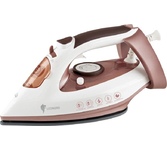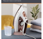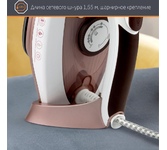 Электронное управление Мощность 2400Вт Подошва с керамическим покрытием Сухая глажка/спрей/пар/паровой удар/вертикальное отпаривание Индикатор нагрева Функция автоотключение Функция самоочистки Функця "капля стоп" Функция защиты от накипи Объем резервуара для воды 380 мл Паровой удар 0,5 г/удар Подача пара 20г/мин Регулировка подачи пара Шарнирное крепление шнура Длина сетевого шнура 1,7м Размер подошвы 23,1*12,1см Зауженный носик Мерный стакан в комплекте Защита от перегрева
