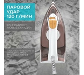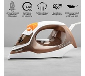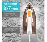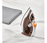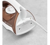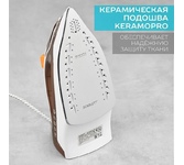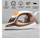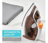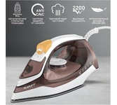Мощность 2200 Вт / Резервуар для воды 230 мл / Постоянная подача пара 20 г/мин / Паровой удар 100 г / Керамическое покрытие / Индикация готовности к работе / Защита от перегрева / Шарнирное вращение шнура на 360 / Длина сетевого шнура 1.6 м