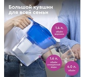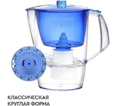 Классический кувшни для большой семьи, объем кувшина 3,6 литра, объем воронки 1,5 литра, классическая круглая форма, мерная шкала на корпусе, срок службы не более 5 лет, цвет: синий, кассета в комплекте, ресурс кассеты 200 л.