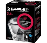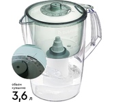 Классический кувшни для большой семьи, объем кувшина 3,6 литра, объем воронки 1,5 литра, классическая круглая форма, мерная шкала на корпусе, календарный индикатор замены кассеты, срок службы не более 5 лет, кассета в комплекте, ресурс кассеты 350 л.