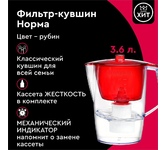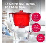 Классический кувшни для большой семьи, объем кувшина 3,6 литра, объем воронки 1,5 литра, классическая круглая форма, мерная шкала на корпусе, календарный индикатор замены кассеты, срок службы не более 5 лет, кассета в комплекте, ресурс кассеты 350 л.