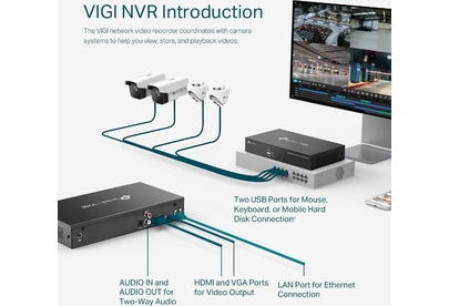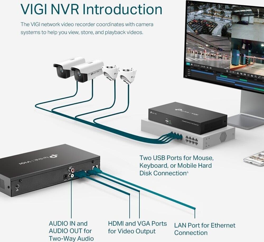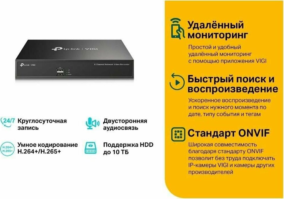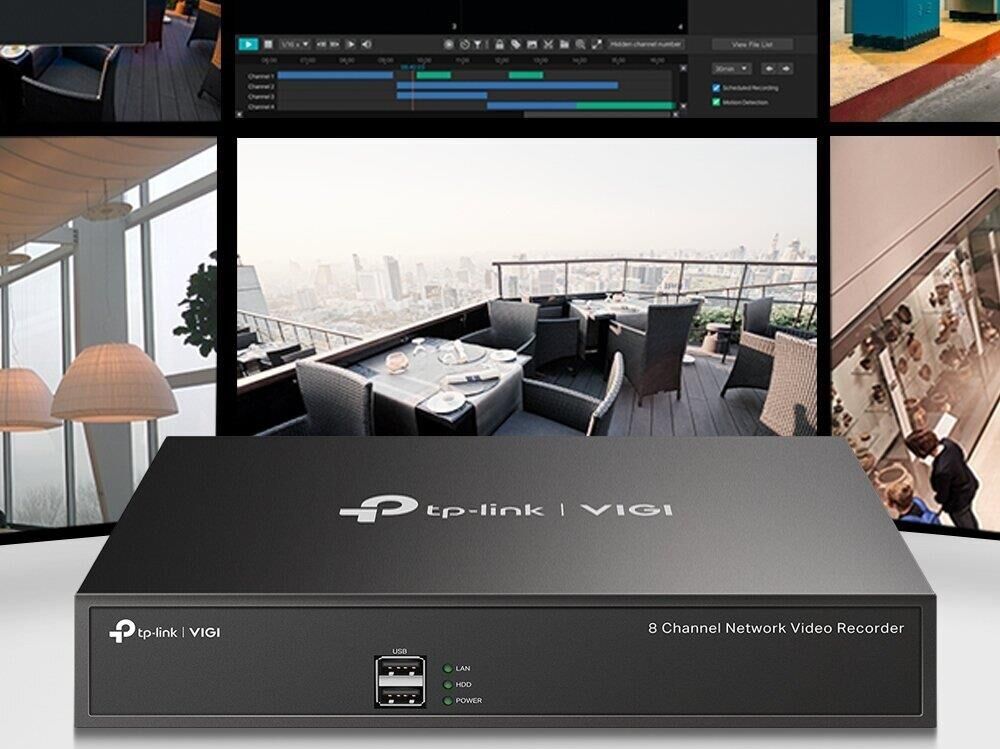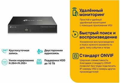 NVR VIGI Подключайте камеры к сетевому видеорегистратору VIGI для просмотра, хранения и воспроизведения видео. Непрерывная круглосуточная запись Автоматическое хранение до 10 ТБ видео с подключённых камер для быстрого и удобного доступа. Изображение со всех камер на одном экране Чёткое изображение до 5 МП и восемь каналов позволят разглядеть каждую деталь с любого ракурса.