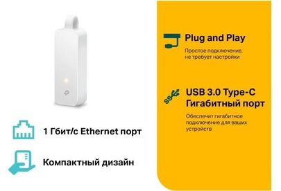 Сетевой адаптер USB Type C/Gigabit Ethernet TP-LINK UE300C Отличное решение для подключения ноутбуков, планшетов и других устройств с разъёмом USB Type-C к проводной сети. Высокоскоростное решение USB 3.0/Gigabit Ethernet обеспечивает передачу данных со скоростью до 1 Гбит/с. Поддержка Plug and Play для Windows 10, Mac OS X (10.9 и новее), Chrome OS и Linux OS. Складной портативный дизайн идеально подходит для ноутбуков типа Ultrabook Интернет-подключение по кабелю для устройств USB-C Создайте мгновенный скоростной доступ к проводной сети для ноутбука, планшета, компьютера и других устройств с разъёмом USB Type-C. Гигабитное подключение UE300C оборудован портами USB 3.0 и Gigabit Ethernet, а также поддерживает скорость передачи данных до 1 Гбит/с, благодаря чему он идеально справляется с передачей больших файлов, стримами, онлайн-играми и не только. Складной портативный корпус Вес: 20 г Размеры: 71 ? 26 ? 16,2 мм Характеристики Тип: Сетевой адаптер Интерфейс: USB Type C Скорость: 10/10